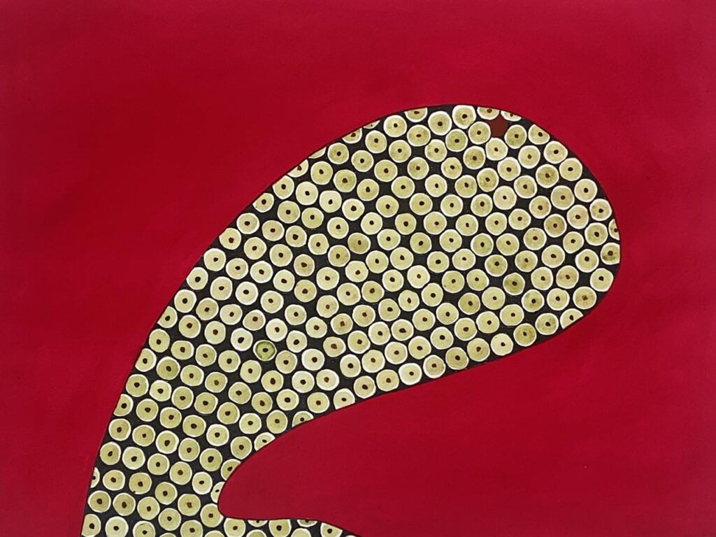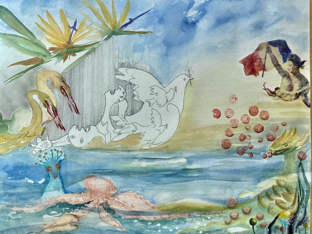 Audrey Laus mesclou colagem, bordado e aquarela em “Fios e Gestos”, inspirado na obra “Mãos Olhudas”. A costura e o bordado remetem aos gestos da avó materna, que se dedicava às artesanias têxteis e à cura, marcando o tecido da existência.