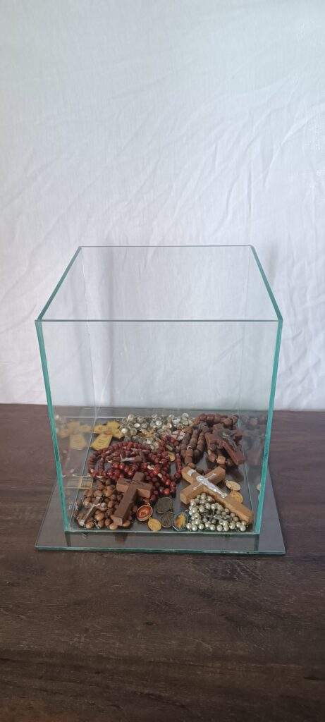 “Nas xícaras, guardo o afeto que continua vivo; nos bichinhos, os mundos que encontrei e que me encontraram; nos copinhos, as celebrações; e nos presépios, a origem que ainda respira. O que guardo não é objeto, é rastro, presença, permanência, onde a memória não dorme, mas habita.”