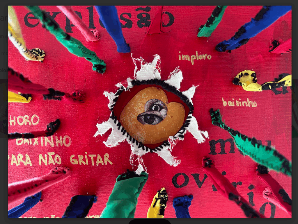 Júlia reconfigura a explosão, que nasce de uma vagina, com olhos animais e humanos à espreita. “Meu fazer artístico evoca a luta contra a violência de gênero sofrida pelas mulheres, por meio dos olhos que saltam das formas orgânicas tridimensionais”, frisa.