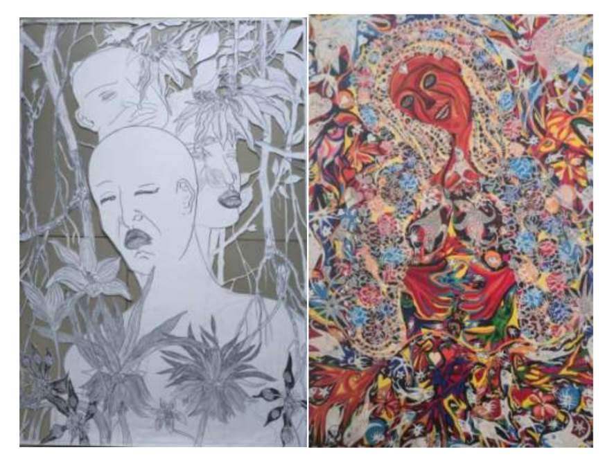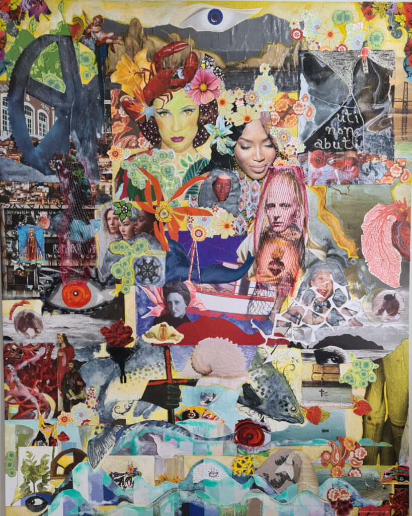 O presidente da Acap, Gelsyr Ruiz, traz “Fragmentos do Presente”, uma referência à obra de Vera, usando colagem analógica. “As figuras que crio se tornam territórios híbridos, espelhando a degradação ambiental e as novas formas de gênero, em tensões entre o sagrado, o profano e a identidade. Meu gesto, enquanto coletor, reinscreve memória, mito e urgência contemporânea em diálogo com o presente”, descreve. Para Eli, criou “Seria Essa a Salvação?”, com colagens que entrelaçam imagens de degradação ambiental com fotografias autorais e fragmentos. Sobre essas camadas, uma “árvore espiritual”, que anuncia o renascimento.