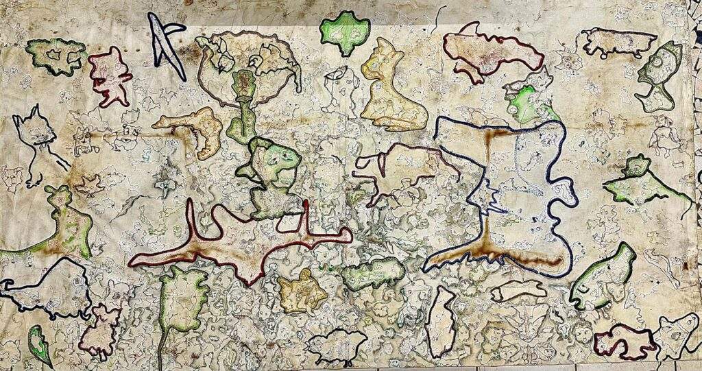 Silvia Da Ros criou o bordado “Morphogenesis”, no qual contempla a criação do Mundo Ovo. Ela conheceu Eli num evento e passou a admirá-la não só como pintora, escultora e escritora, mas pela forma de expressar-se. “Tento ser múltipla em figuras que caracterizo como humanóides, bem como nas de um fictício bestiário coletados nas marcas de fungos de uma velha cortina, uma peça que tanto separa mundos como, quando aberta, une.”