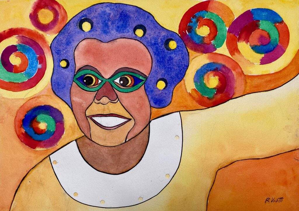 Roberta Viotti resolveu eternizar o largo sorriso de Eli, “uma artista poliédrica”. Como sempre gostou de fazer retratos, primeiro com grafite e depois com aquarela, traz duas versões de retratos da artista: a primeira com as cores naturais da foto e, a outra em formas coloridas, trazendo elementos de suas pinturas, como os círculos, as cores vibrantes e os contornos.