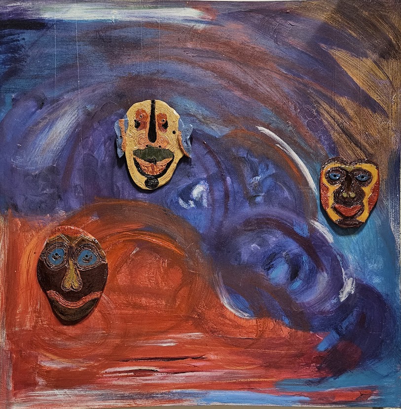 Dulce Penna volta a mesclar suas inconfundíveis máscaras de cerâmica em “Três Faces do Eu”. Sobre uma tela de acrílico, emergem do barro os rostos em transformação, corpos de cor e expressão. A tela de acrílico, pintada em 2010 com tons azuis, roxos e vermelhos, serve de chão para o encontro entre pintura e cerâmica. “É uma homenagem à força criadora de Eli Heil, mas também uma busca pessoal”, reflete.