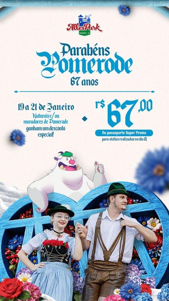 Pomerode completa nesta quarta-feira, 21 de janeiro, 67 anos de história. A celebração ocorre simultaneamente à 41ª Festa Pomerana, que destaca a cultura alemã com gastronomia típica, danças folclóricas e competições que atraem milhares de visitantes à região. Como parte das festividades locais, quem vive ou nasceu na cidade terá a oportunidade de comemorar o aniversário da cidade com uma experiência de lazer no Alles Park.