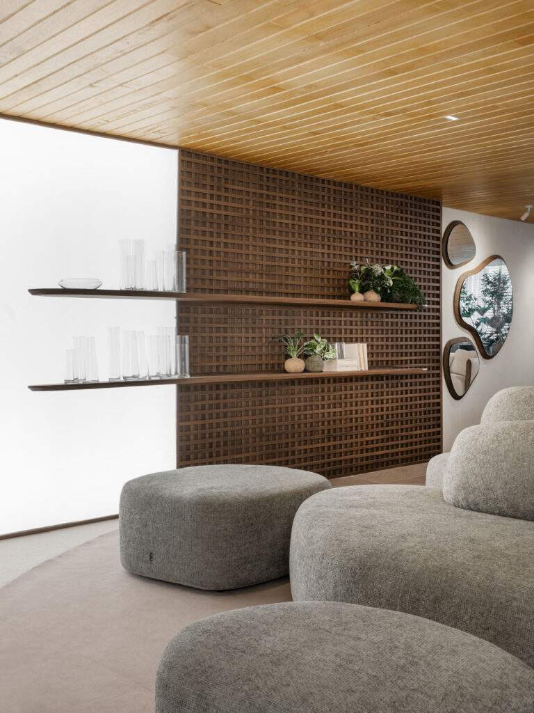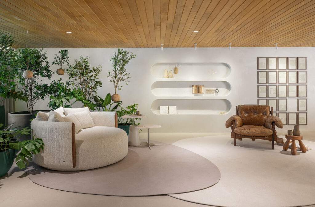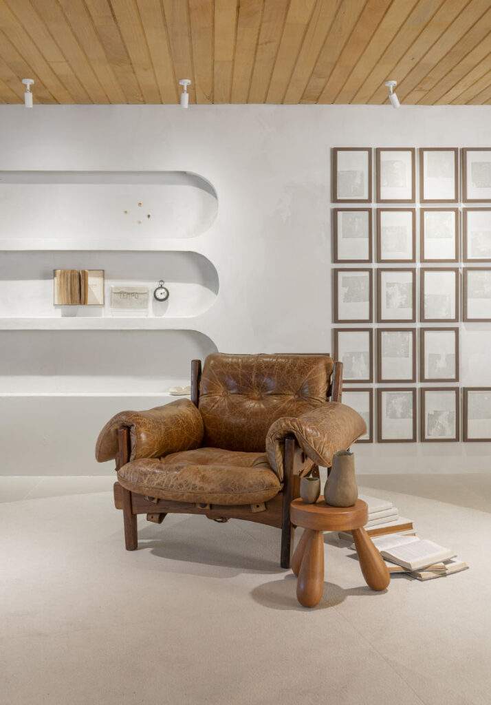 Radicada em Criciúma, no Sul do Estado, a arquiteta dispõe em 100m² um lounge dividido em três “momentos” a serem desfrutados pelos visitantes da mostra: no espaço vivo a área verde e a Poltrona Moleca, uma irmã da famosa Mole, também assinada por Sergio Rodrigues – em seu estado mais bruto após anos de uso -, convidam ao relaxamento; no espaço central são os sofás orgânicos, em diferentes tonalidades e texturas, que trazem movimento ao ambiente; enquanto no espaço de conversa, com direito a um bar, permite mais integração.