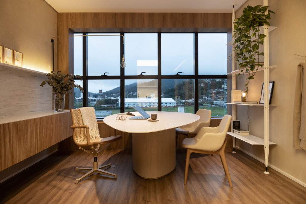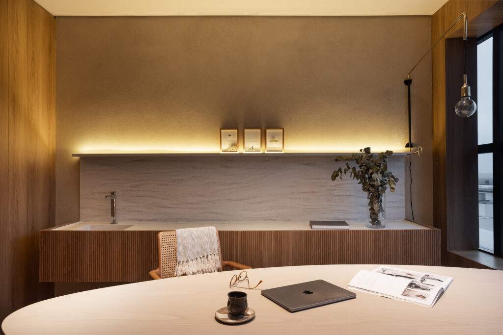 A ergonomia e a proximidade também foram premissas do projeto. A mesa da recepção foi projetada na altura de uma mesa convencional, em vez do tradicional balcão elevado, reduzindo a barreira entre o paciente e o recepcionista, promovendo acolhimento e conexão desde o primeiro contato.