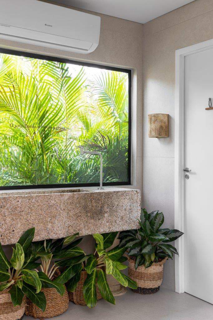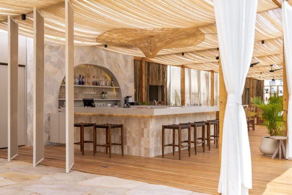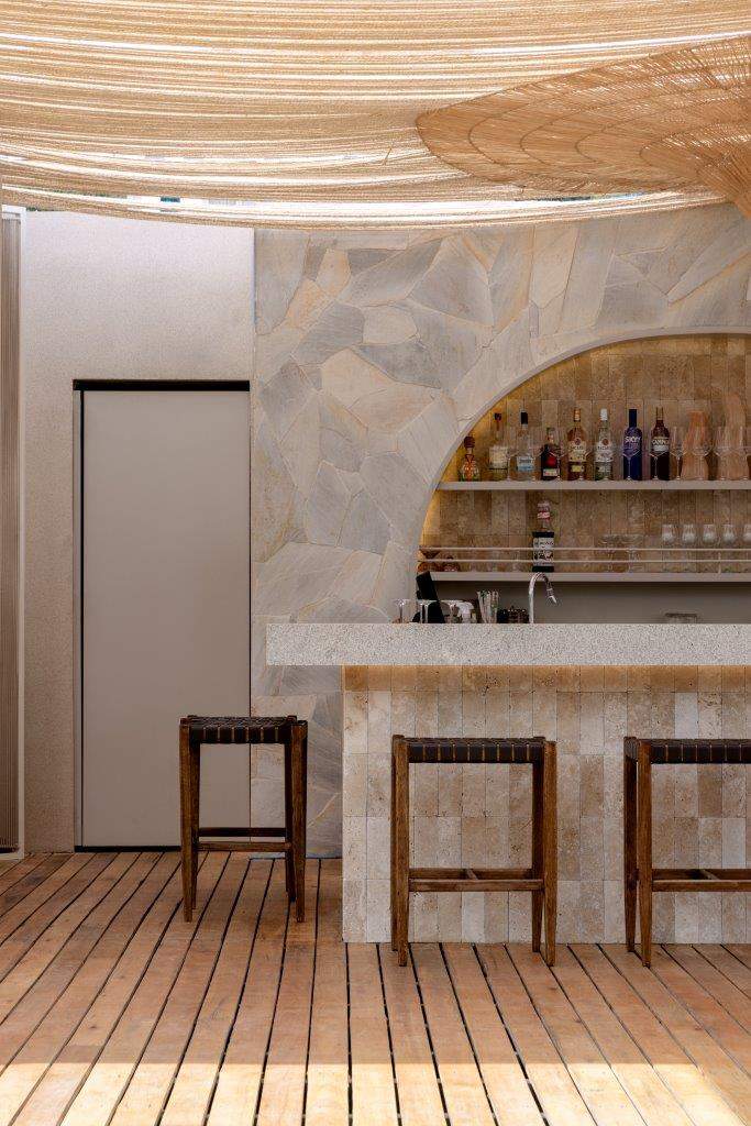 A materialidade desempenha papel central na construção da identidade do projeto. A seleção de materiais buscou equilibrar estética, durabilidade e resistência ao clima litorâneo. A madeira natural aparece na estrutura e no mobiliário, trazendo calor e textura. Revestimentos minerais e pedras reforçam a durabilidade e estabelecem uma conexão direta com a paisagem. Tecidos leves filtram a luz e introduzem movimento à arquitetura, enquanto elementos artesanais acrescentam delicadeza e humanizam os espaços.