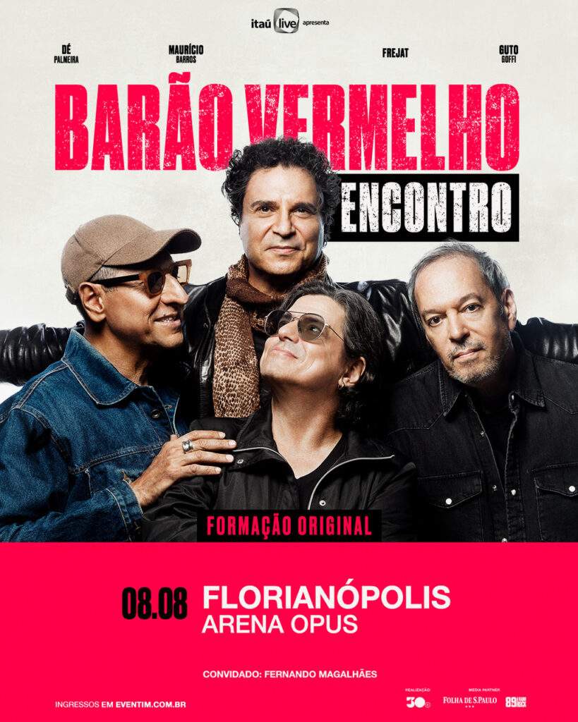 Quando o jornalista e produtor Ezequiel Neves ouviu a primeira fita do Barão Vermelho, ele sentenciou: “É rock puro, escrachado e demencial, imperfeito e carnívoro. Trombetas selvagens anunciando o começo de um novo mundo”. Ao emoldurar o sentimento de rebeldia e liberdade dos anos 1980 com a “voz de Cazuza cuspindo fogo em doses avassaladoras” (como bem disse Ezequiel), o grupo revolucionou o cenário musical da época. As canções, com poesia e irreverência, deram conta de se tornar a trilha sonora de um país complexo como o Brasil e ultrapassaram gerações pela atemporalidade das letras. Barão Vermelho Encontro reúne a formação original do grupo: Roberto Frejat (guitarra e voz), Guto Goffi (bateria), Mauricio Barros (teclados) e Dé Palmeira (baixo) – e terá ainda como convidado especial o guitarrista Fernando Magalhães, que ingressou no grupo em 1985.