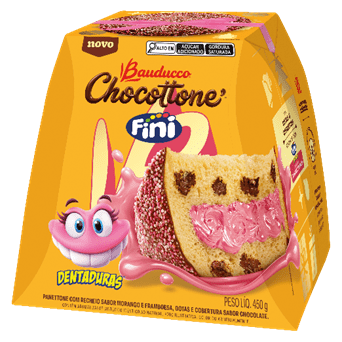 Bauducco Chocottone® Fini Dentaduras® Sabor Morango e Framboesa (450g), com recheio de sabor Fini® Dentaduras mais gotas e cobertura sabor chocolate com confeitos coloridos.