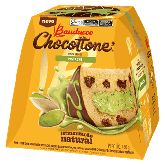 Bauducco Chocottone® Pistache (450g), com recheio do sabor que já é um novo clássico mais gotas e cobertura sabor chocolate e riscas sabor pistache.