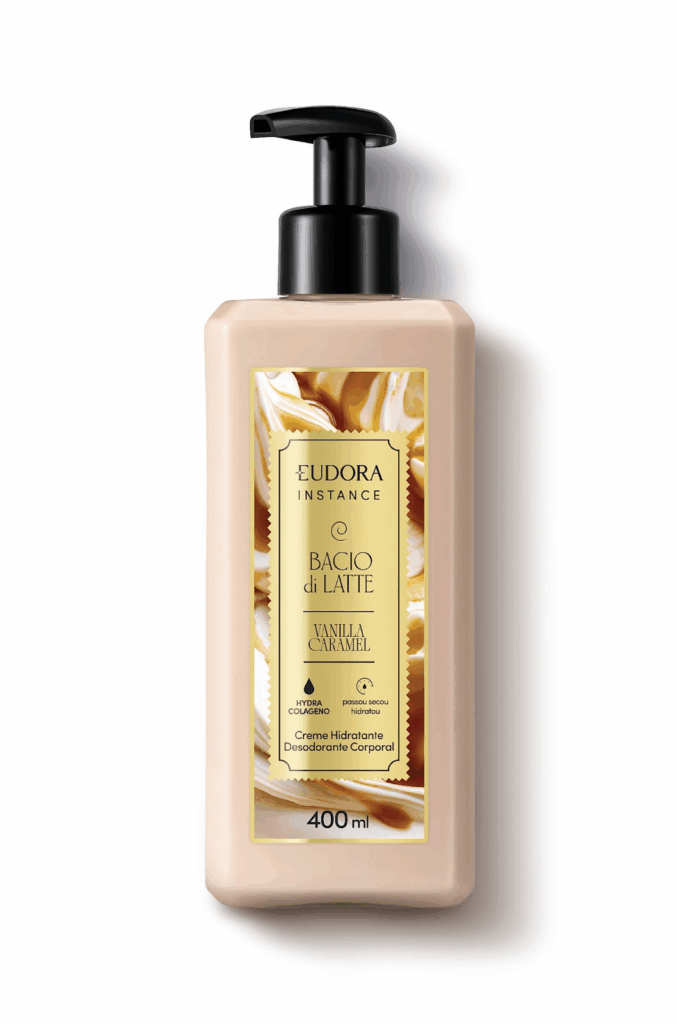 Enriquecido com Hidracolágeno, colágeno vegetal, proporciona sensação de firmeza e vitalidade, deixando a pele irresistivelmente macia e com um toque aveludado. A linha conta com o Acorde Bacio di Latte: notas olfativas extraídas a partir da casquinha crocante com o clássico sabor Bacio di Latte, trazendo uma faceta gourmand inconfundível para ambas as fragrâncias. Eudora Instance Vanilla Caramel combina a amada Baunilha de Eudora Instance com caramelo e o delicioso acorde Bacio di Latte em uma fragrância oriental envolvente e marcante.