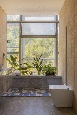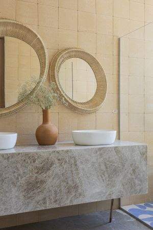 A materialidade também reforça essa proposta ao combinar o revestimento natural e artesanal Invecchiatto Atacama, aplicado nas paredes do banheiro.. O acabamento INVECCHIATTO da Lepri torna ainda mais confortável e sensorial o toque da pele (dos pés e mãos) e a troca de energia com a matéria prima (barro). Proporciona a mesma sensação de andar descalço na terra. Já a coleção Atacama é moderna e versátil. Possui bordas regulares e tons que alinham e combinam em vários ambientes. É um revestimento artesanal que agrega beleza e faz de cada ambiente uma obra única.