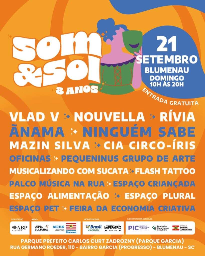 Passando por várias cidades para celebrar seus oito anos de atividade, o projeto Som&Sol desembarca pela primeira vez em Blumenau no domingo (21), com dez horas de programação cultural. A edição especial de estreia na cidade ocorre no Parque Prefeito Carlos Curt Zadrozny, conhecido como Parque Garcia, das 10h às 20h, com entrada totalmente gratuita. O evento reúne feira de economia criativa, apresentações artísticas, oficinas, gastronomia, chopp artesanal e muita música, com ambiente familiar e acessível a todo o público.