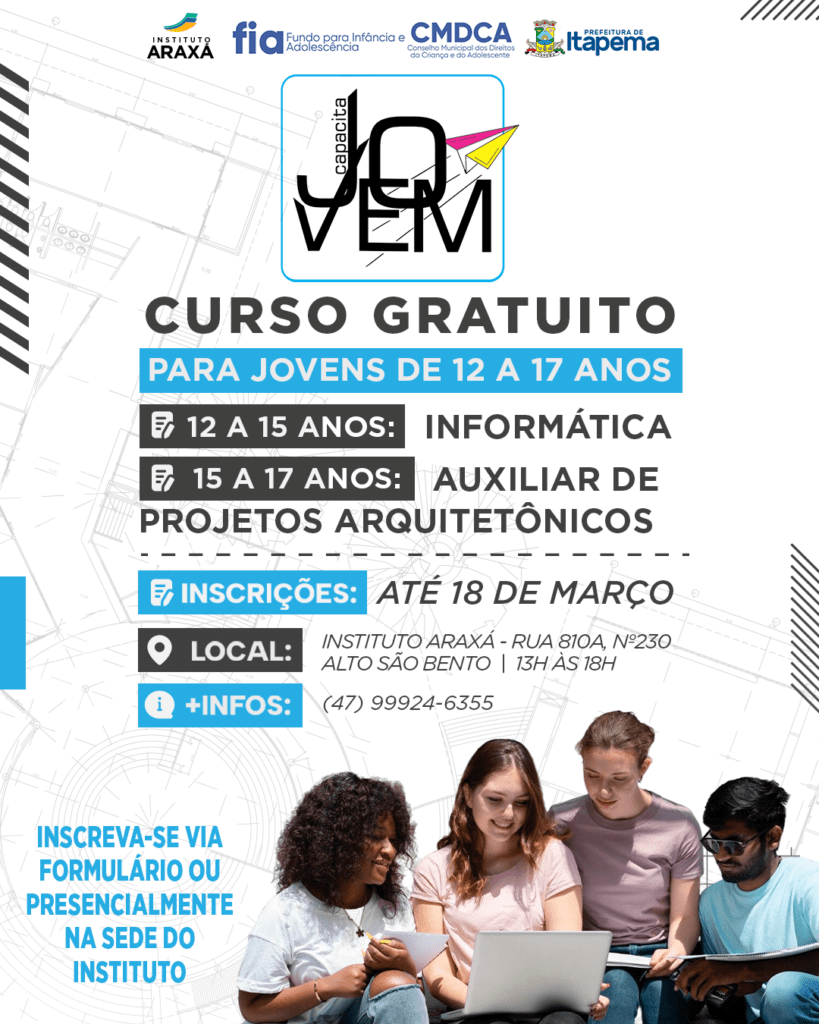 O projeto Capacita Jovem, do Instituto Araxá, está com as inscrições abertas para o seu primeiro semestre. Com dois cursos previstos para a edição 2026, o projeto oferece capacitação gratuita para jovens moradores de Itapema. Os cursos de Informática e de Auxiliar de Projetos Arquitetônicos contará com duas novas turmas de 16 alunos cada, nos períodos vespertino e noturno, com duas aulas por semana. Todos os materiais didáticos e equipamentos necessários serão fornecidos pelo Instituto, localizado na rua 430, nº 22, no bairro Morretes. Os interessados podem se inscrever via formulário online.
