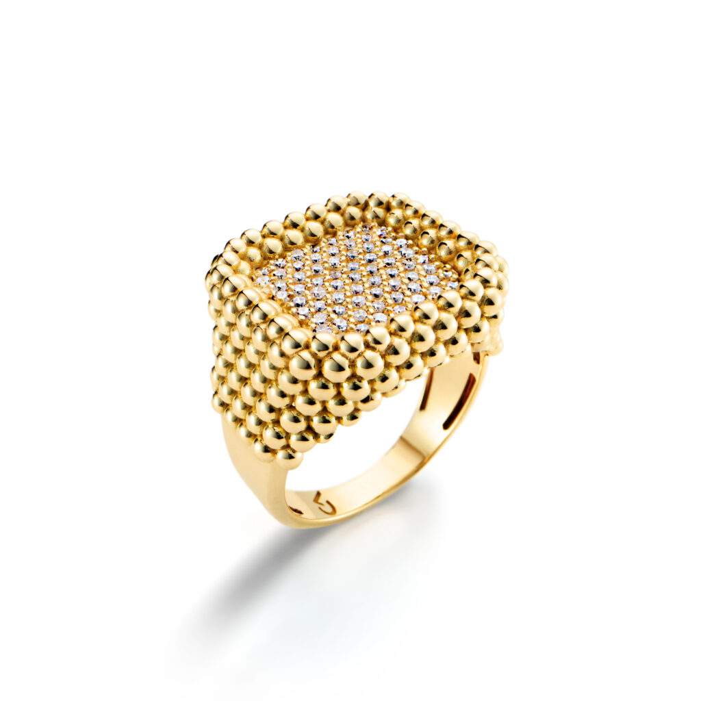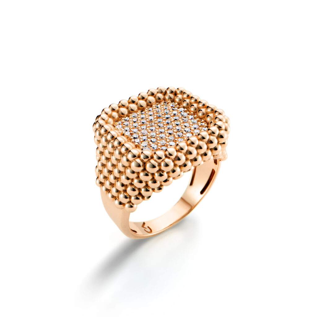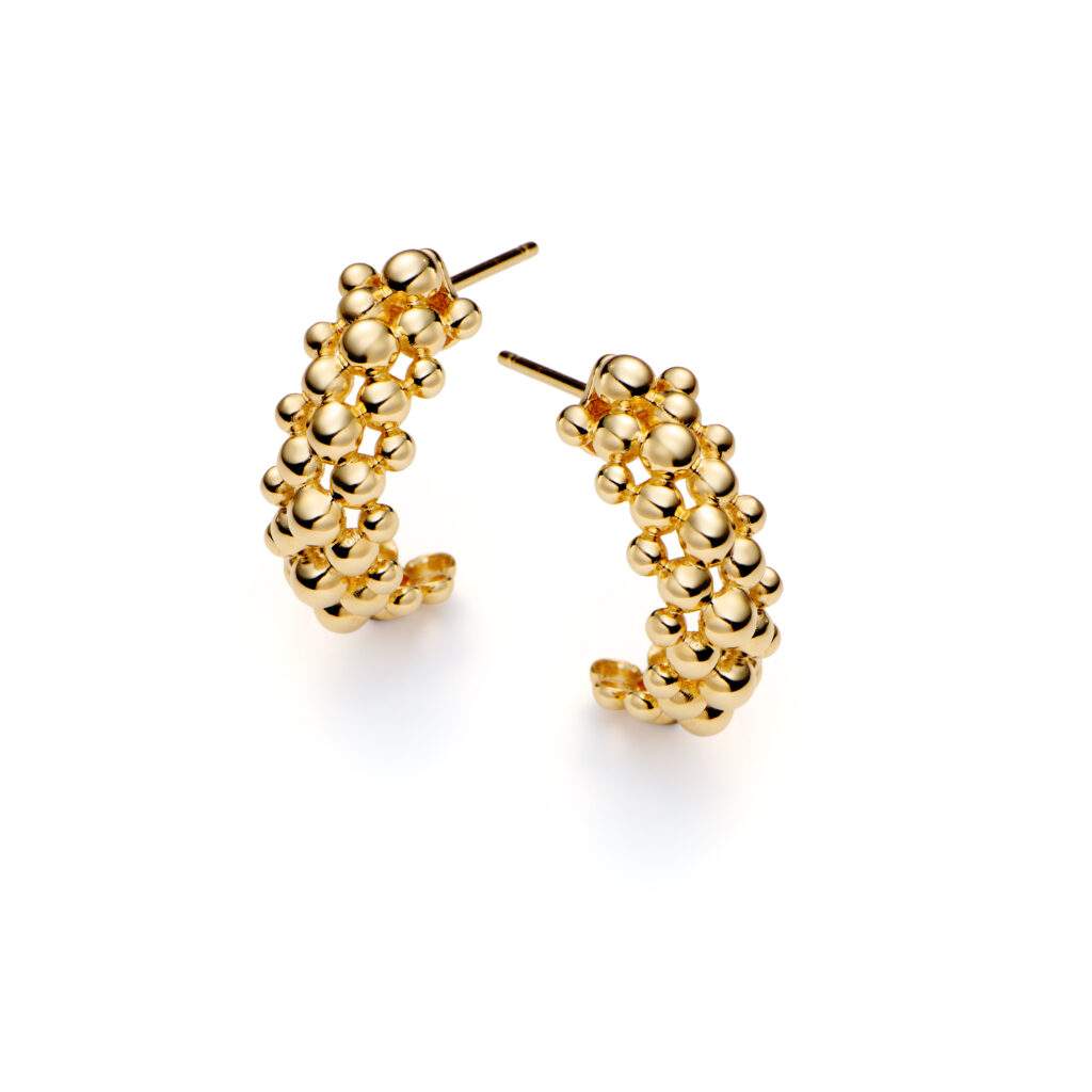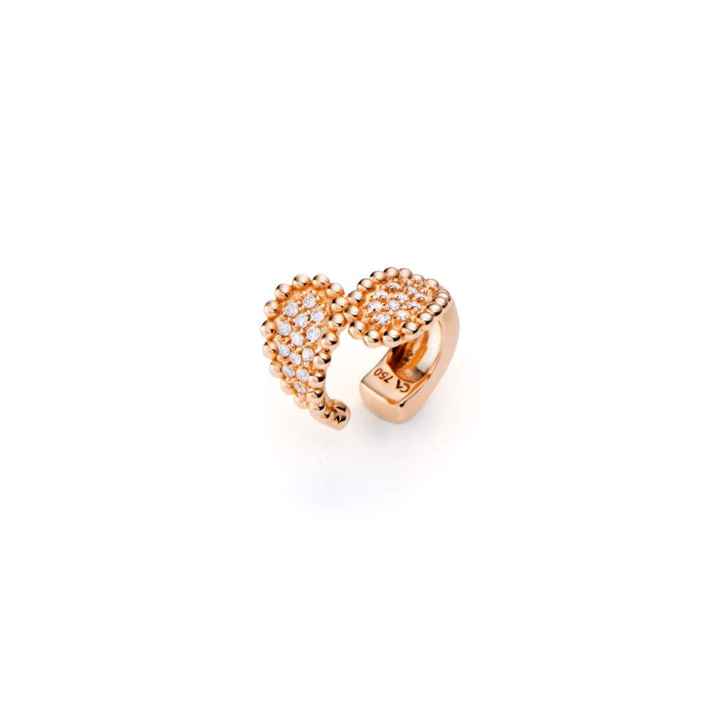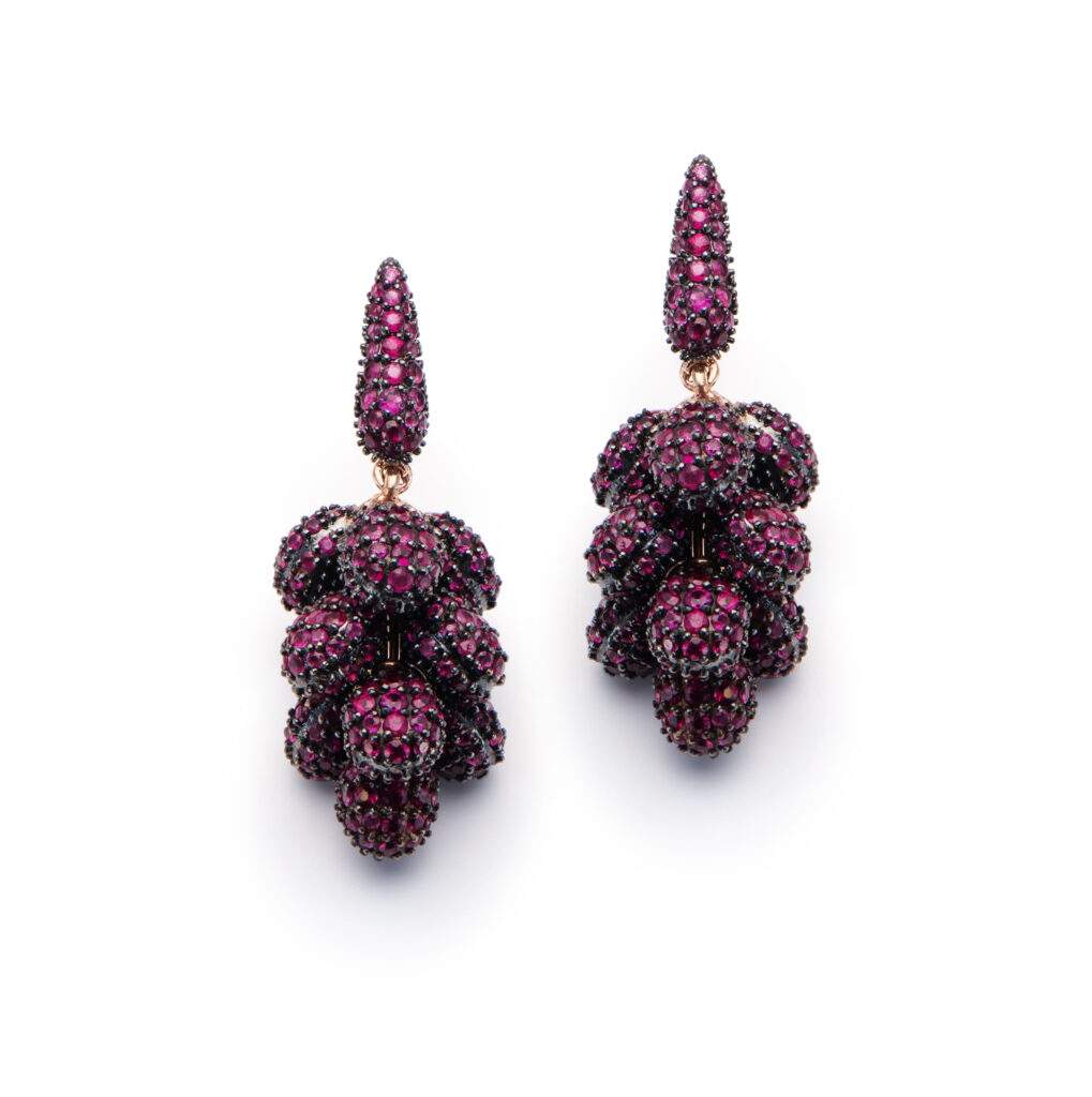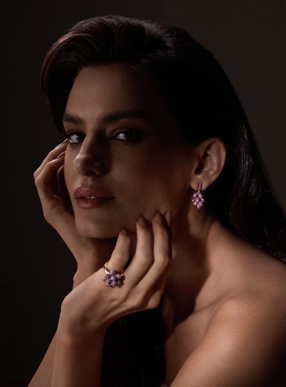 A primeira série da coleção homenageia desenhos criados há cerca de 20 anos e que se tornaram parte importante do vocabulário visual da joalheria. Entre eles está a peça Cachos, forma inspirada na natureza e nas composições orgânicas de frutas e flores. O desenho, que originalmente surgiu em anéis, brincos e gargantilhas em ouro com pedras brasileiras, ganha agora uma nova interpretação em ouro com pavês de pedras preciosas como diamantes e rubis, reforçando a volumetria e o movimento característicos da peça.