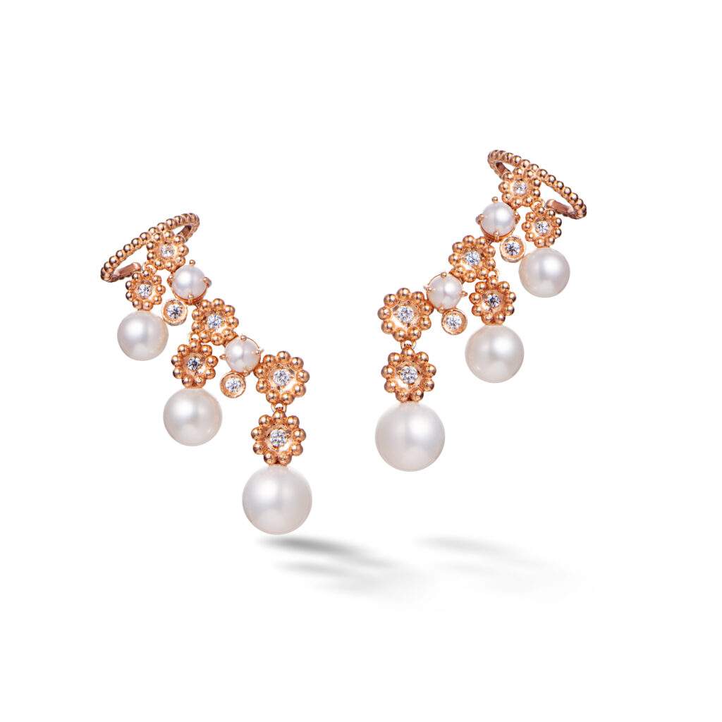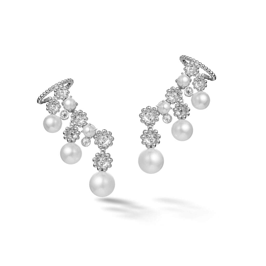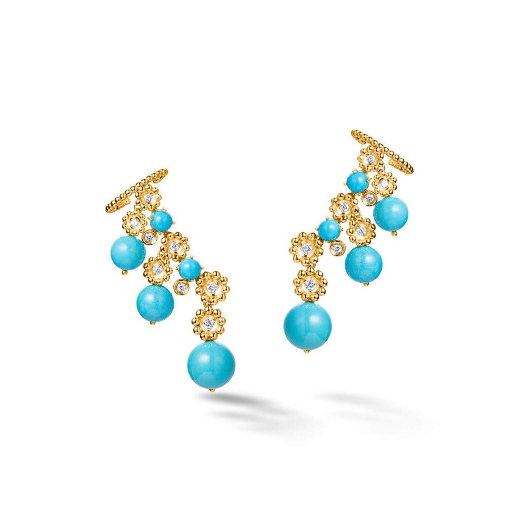 Outro destaque é o desenho Paixão, criado a partir da composição de pequenas flores em ouro e diamantes. Apresentada originalmente em peças como colares e alianças, a forma retorna agora em novos brincos e colares, chamados Nobreza, incorporando turquesas e pérolas. Em sintonia com o repertório da designer, que frequentemente explora joias pensadas para dialogar com a anatomia do corpo, o novo brinco foi desenhado para “vestir” a orelha, criando a impressão de múltiplos furos mesmo para quem possui apenas um.