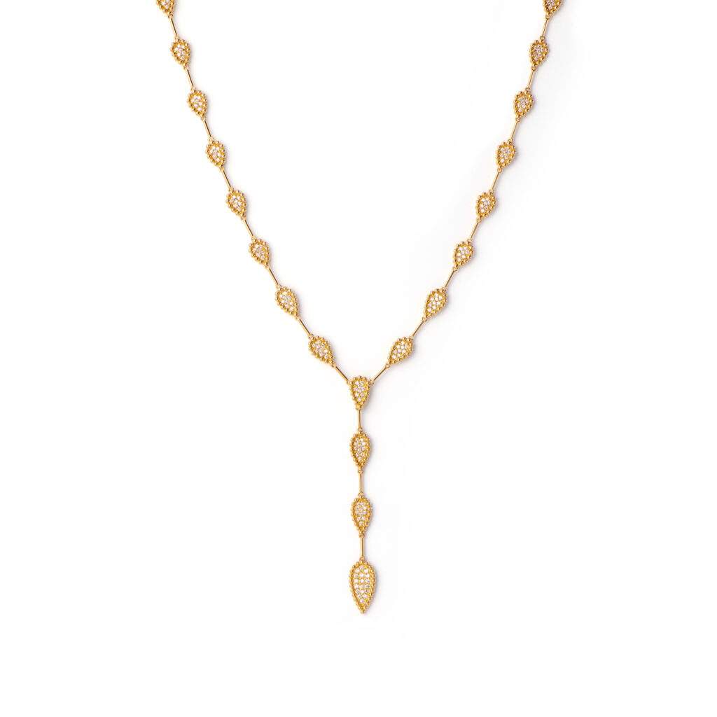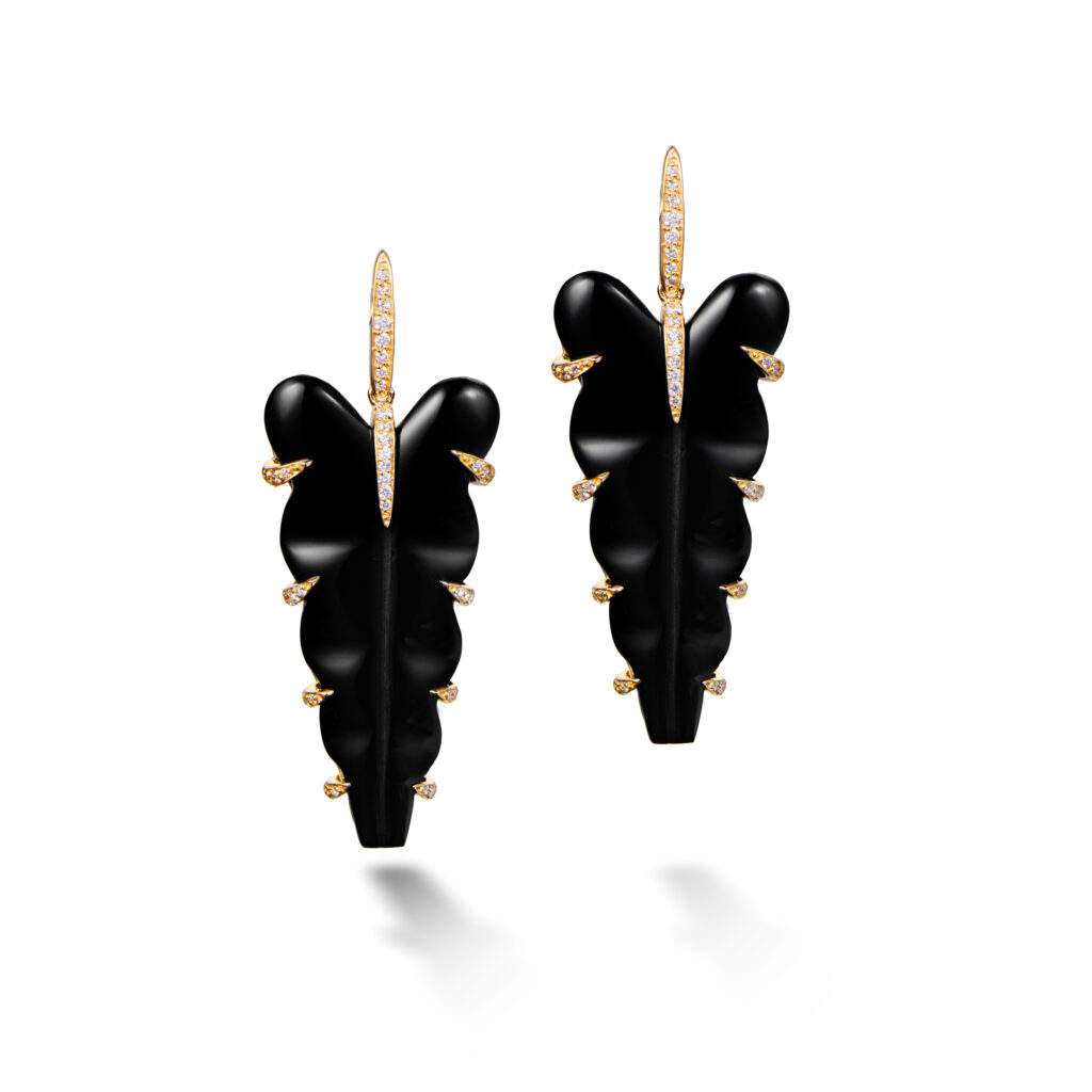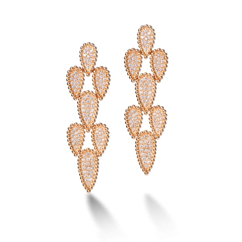 Outro destaque é o desenho Paixão, criado a partir da composição de pequenas flores em ouro e diamantes. Apresentada originalmente em peças como colares e alianças, a forma retorna agora em novos brincos e colares, chamados Nobreza, incorporando turquesas e pérolas. Em sintonia com o repertório da designer, que frequentemente explora joias pensadas para dialogar com a anatomia do corpo, o novo brinco foi desenhado para “vestir” a orelha, criando a impressão de múltiplos furos mesmo para quem possui apenas um.