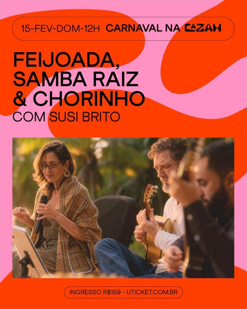 Os ingressos incluem feijoada completa com acompanhamentos. As bebidas serão cobradas à parte, e o cardápio da CAZAH estará parcialmente aberto, com opções como sushi para quem preferir alternativas ao prato principal. Para maiores de 18 anos, será oferecida uma caipirinha cortesia por pessoa. Crianças de até 8 anos não pagam.