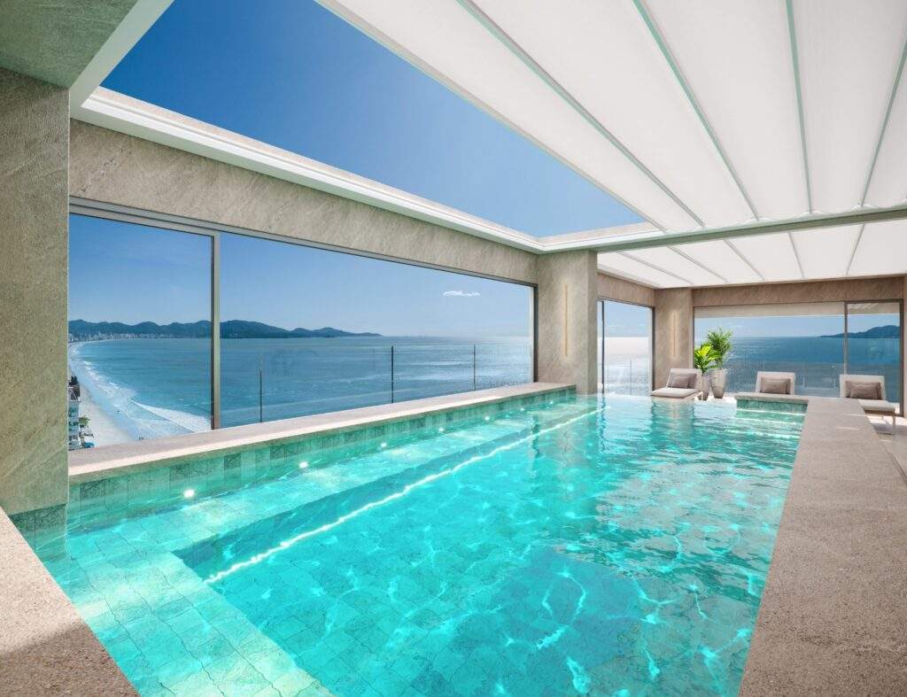 Com entrega prevista para dezembro de 2028, a cobertura foi projetada para oferecer luxo e conforto e máxima integração com a paisagem por meio de vidros de alta tecnologia e vista livre de pilares. A área de festas, no terceiro pavimento, conta com piscina, spa e prainha, rodeada por um terraço amplo com área gourmet e vista total para o mar.