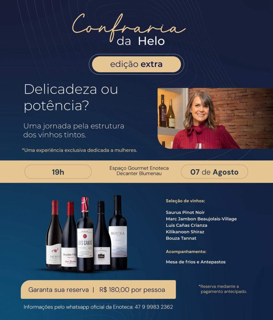 Bastaram apenas 8 horas para que todas as vagas fossem preenchidas para a primeira turma. A primeira edição da Confraria da Helo, marcada para o dia 6 de agosto, às 19h, na Enoteca Decanter Blumenau, teve ingressos esgotados no mesmo dia da divulgação. Foi uma grata surpresa!