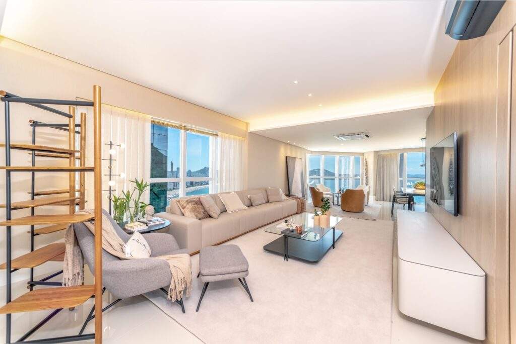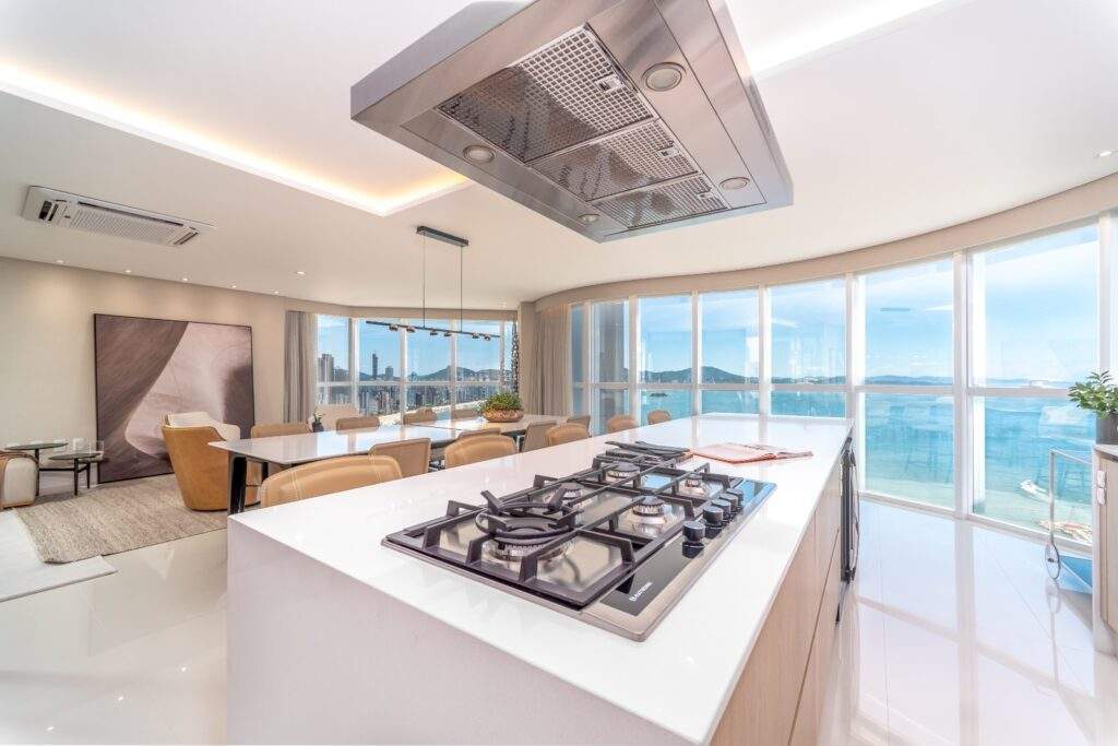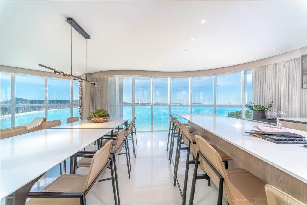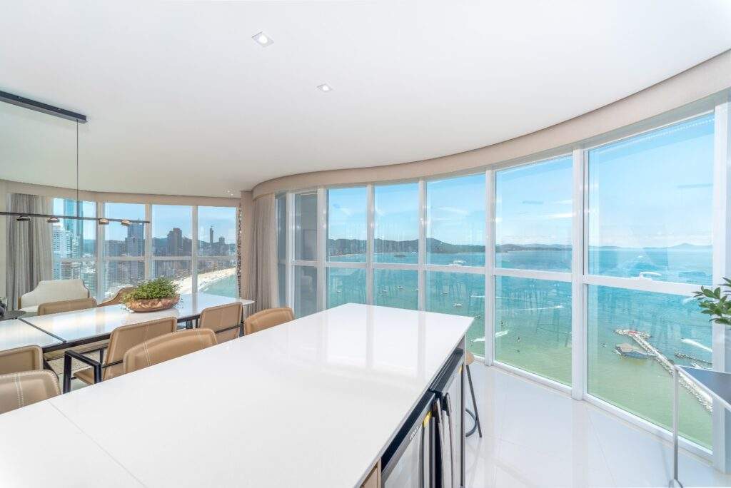 Com 238 m² de área privativa e quatro suítes, um dos grandes atrativos é a vista privilegiada para a orla, onde é possível apreciar o mar e acompanhar a chegada dos cruzeiros, além de atrativos do município como o espetáculo de fogos que marca o Réveillon em Balneário Camboriú.