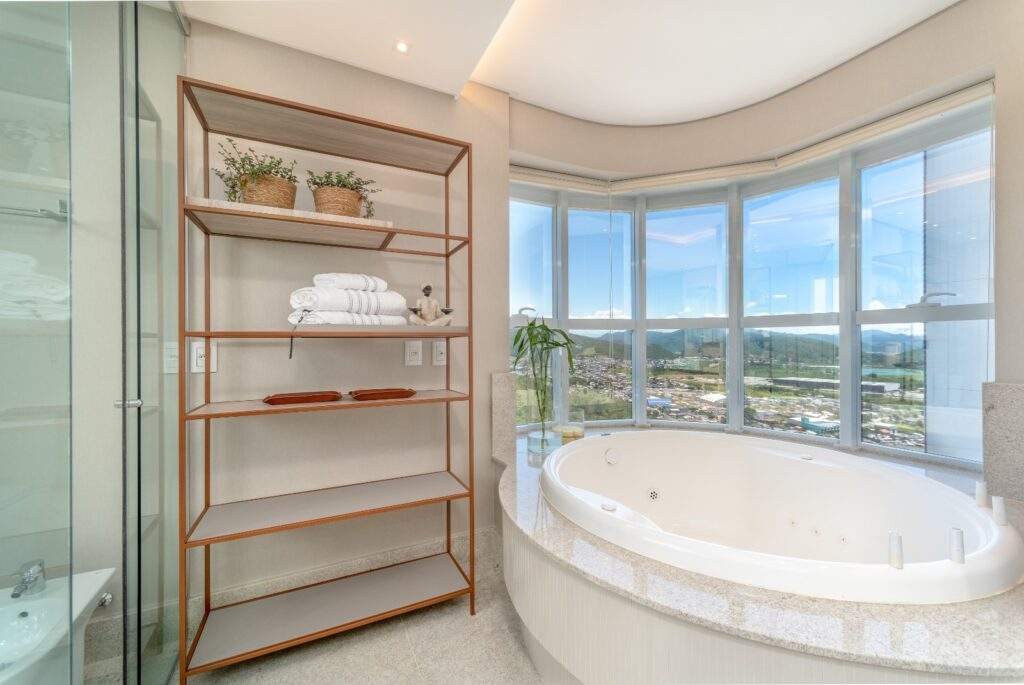 Além do projeto arquitetônico sofisticado e da decoração com elementos orgânicos e atemporais, um dos raros apartamentos à venda possui suíte máster de 42 m² com banheira panorâmica, revestimentos em pedras nobres e uma área social que une lounge, home theater, sala de jantar e cozinha com vista permanente.