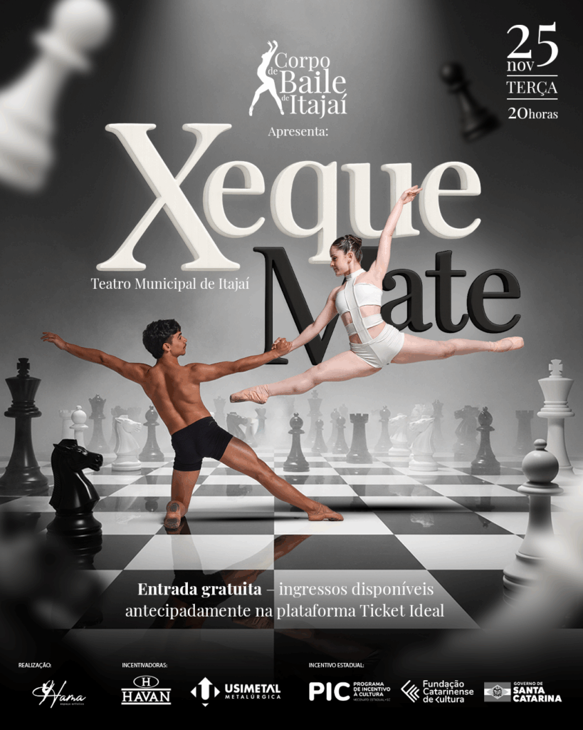No tabuleiro da dança, cada corpo é uma peça em movimento. Em “Xeque-Mate”, o Corpo de Baile de Itajaí transforma o jogo em arte e celebra o encerramento de um ciclo de formação técnica. O espetáculo será apresentado no dia 25 de novembro (terça-feira), às 20h, no Teatro Municipal de Itajaí, com entrada gratuita, mediante retirada antecipada de ingressos na plataforma Ticket Ideal.