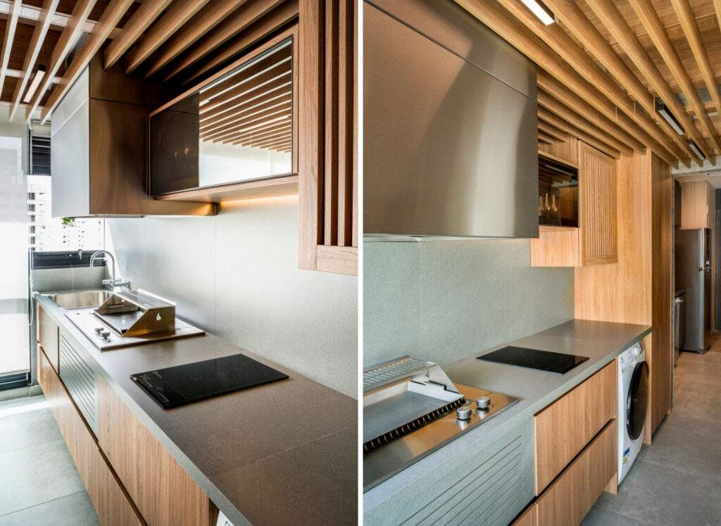 Neste estúdio de um chef, assinado pela arquiteta Denise Barretto, a cozinha deixa de ser um espaço isolado para assumir um papel ampliado. A proposta parte da integração de diferentes funções — churrasqueira, lavanderia e preparo dos alimentos — reunidas em uma única prumada, resolvida por meio da marcenaria.