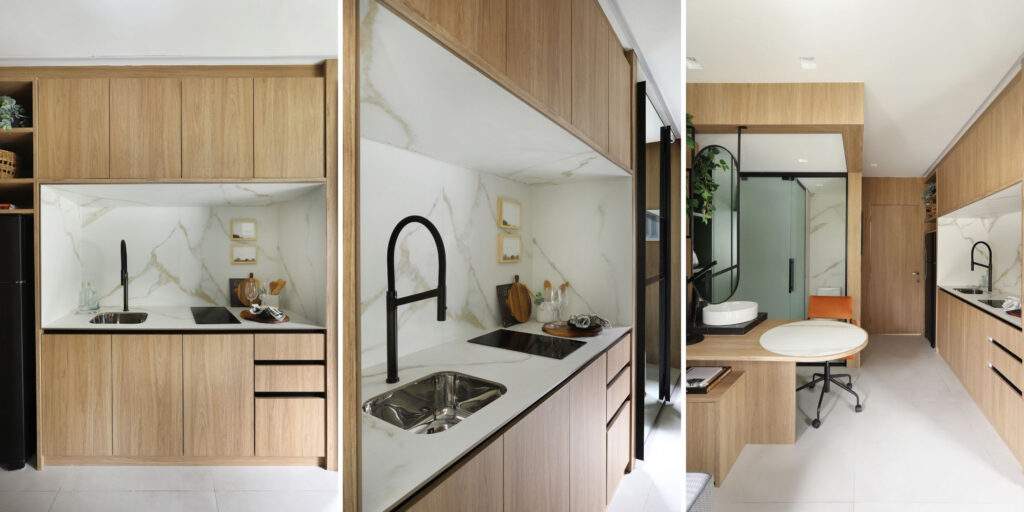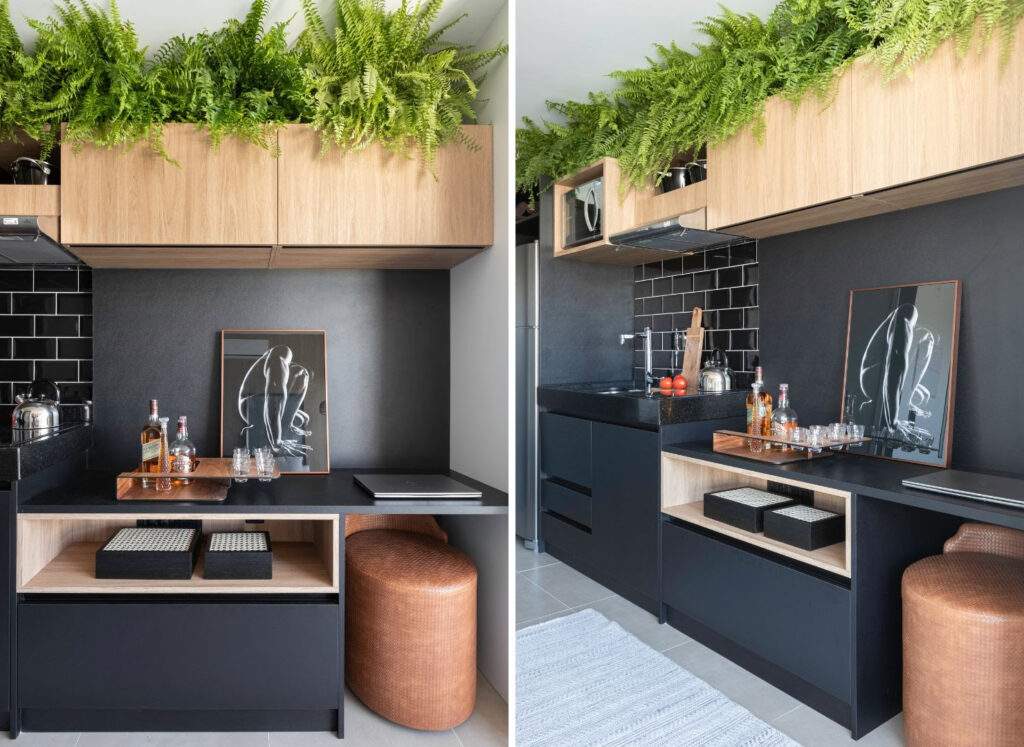 A variação de níveis orienta toda a configuração do mobiliário, estabelecendo uma hierarquia clara entre as funções no espaço compacto. No projeto da arquiteta Danielle Otsuka, à frente do escritório Lilutz Arquitetura, a bancada principal concentra a área molhada em um plano mais elevado, enquanto a continuidade do móvel se desdobra em uma superfície rebaixada, destinada a usos mais flexíveis.
