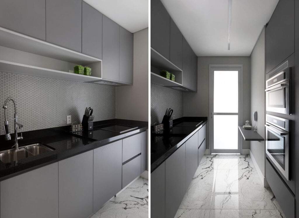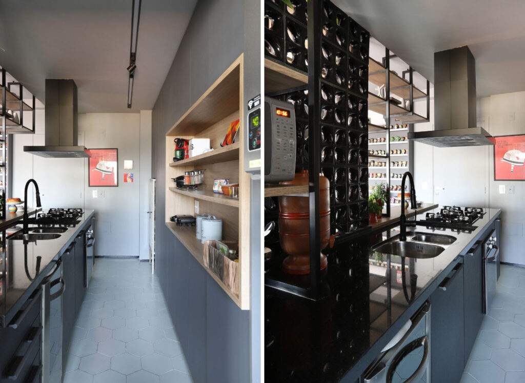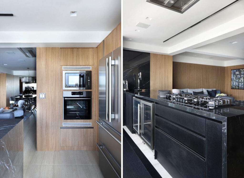 A solução se completa com o equilíbrio entre áreas abertas e fechadas. Nichos acomodam itens de uso frequente, enquanto os armários ocultam eletrodomésticos e utensílios, mantendo o conjunto organizado. “Quando as soluções são bem resolvidas, elas não só organizam, mas definem como o espaço será percebido”, destaca Karina.