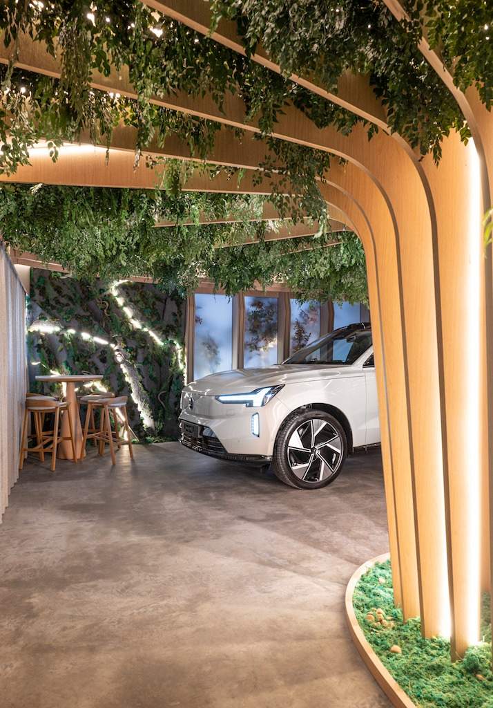 Dos modelos mais icônicos da Volvo, os profissionais também buscaram elementos para o Conexão entre Caminhos. O gradil do XC90 ganhou releitura na janela do espaço, enquanto a lanterna traseira em curva do EX90 está presente também em um painel de LED que ilumina o ambiente.