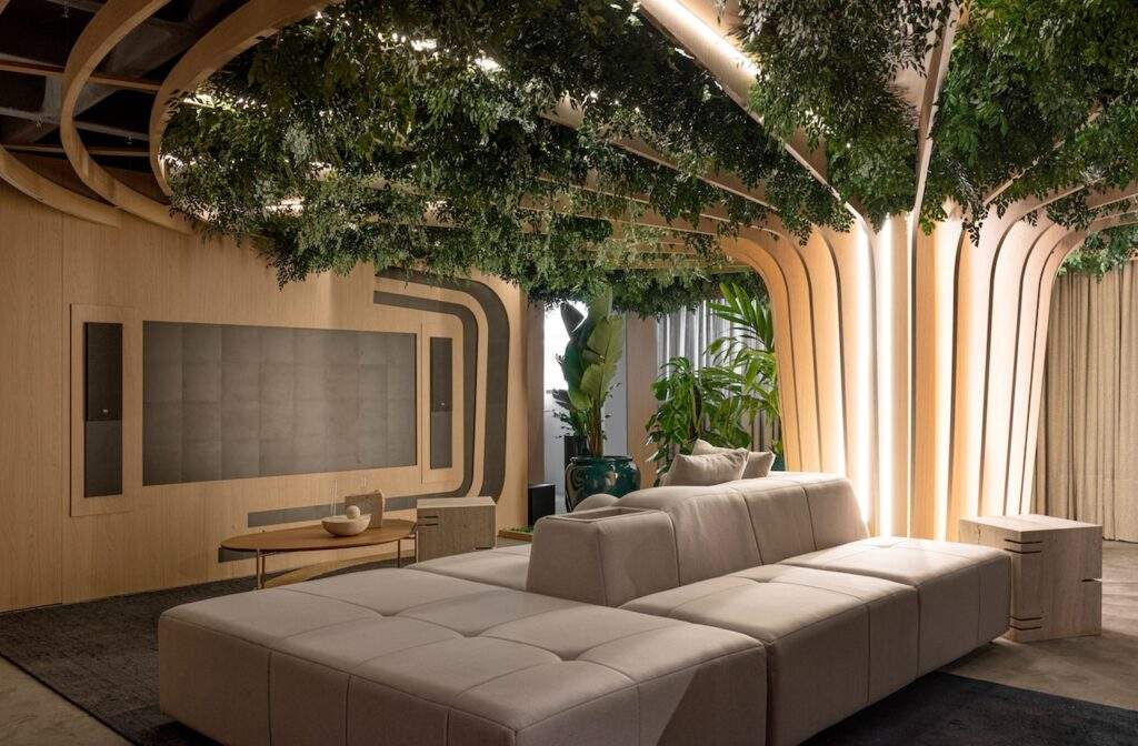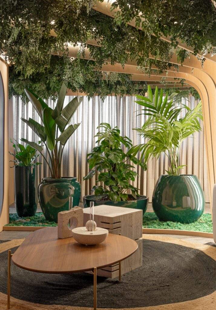 “Mergulhamos na história da Volvo e nos inspiramos na região de origem da marca, do tipo de vegetação ao lifestyle. Do museu da Volvo surgiu um dos principais elementos do ambiente: uma árvore que perfaz todo o espaço, abraçando a proposta de interiores”, compartilha Phellipe.