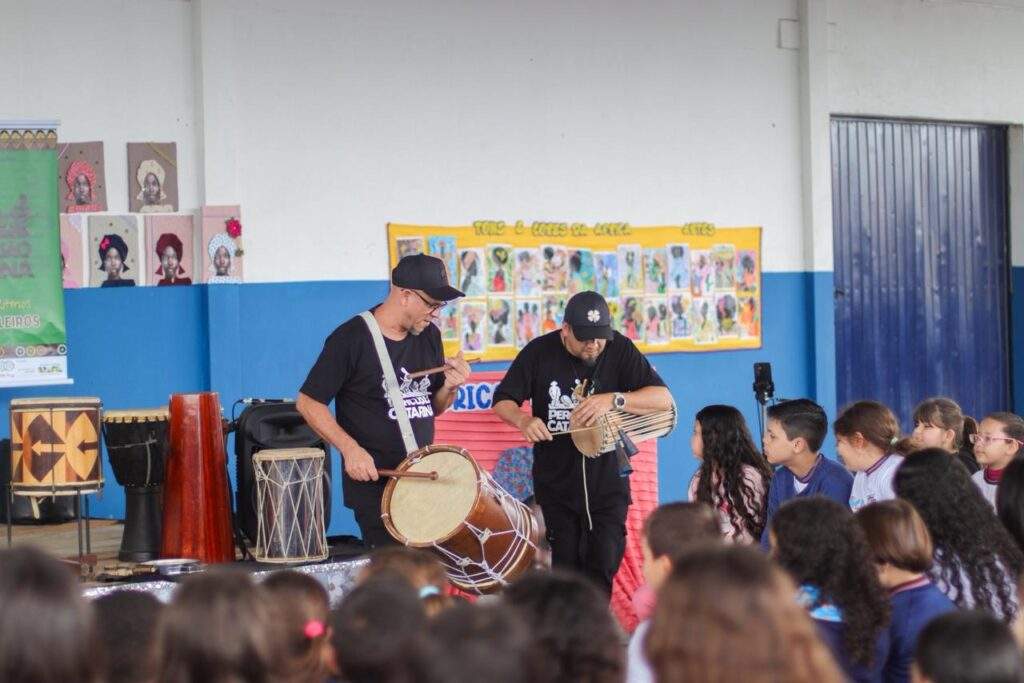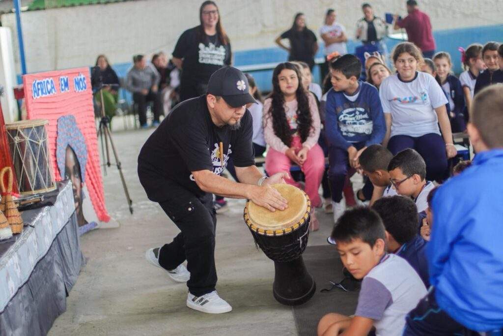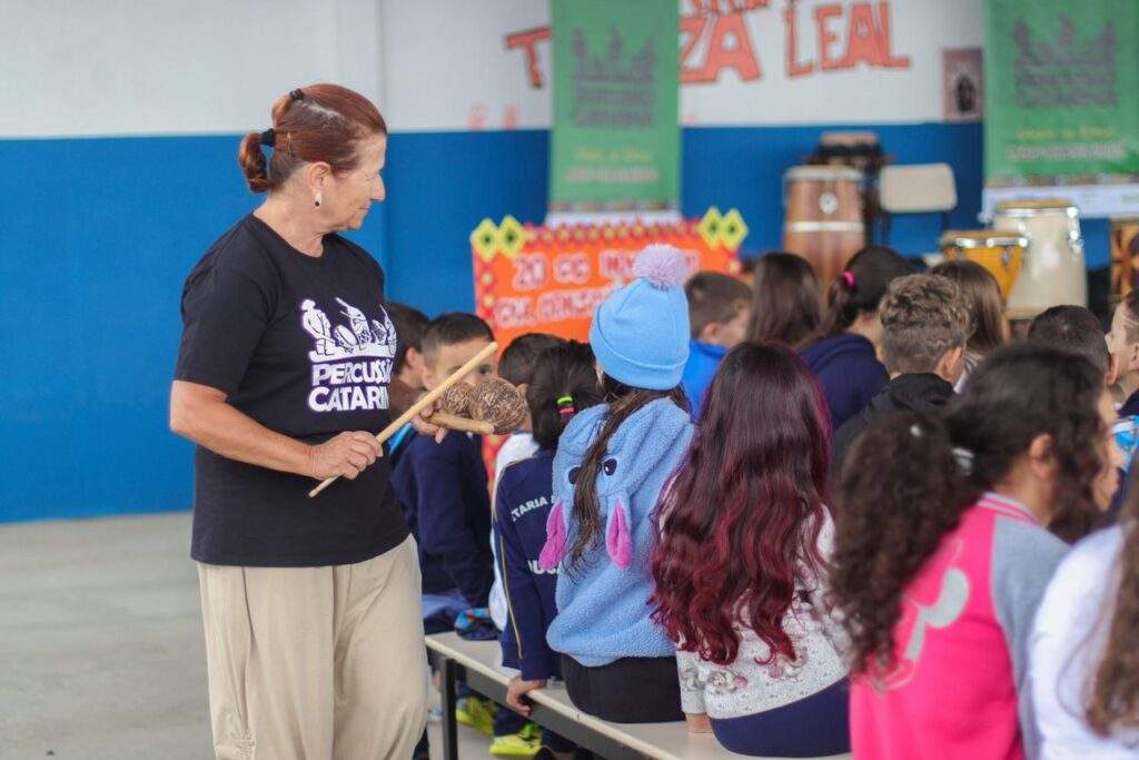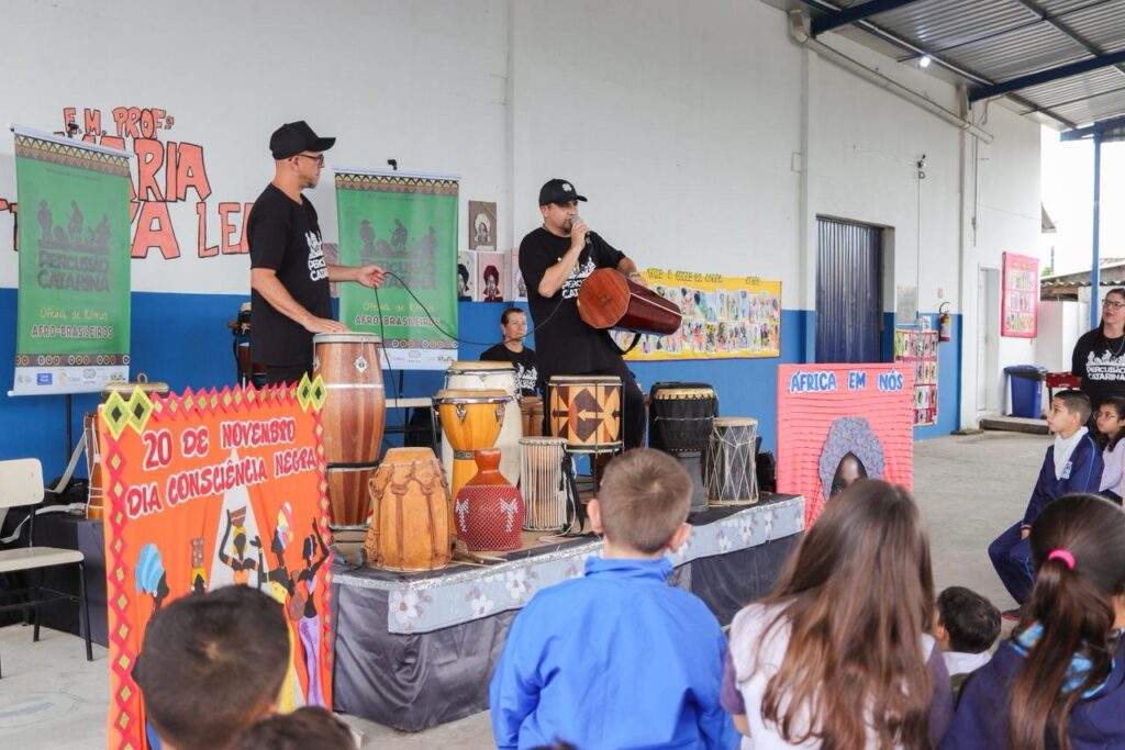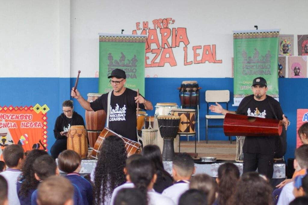 Na semana em que se celebra o Dia da Consciência Negra, alunos da Escola Municipal Professora Maria Tereza Leal, em Navegantes, participaram de uma atividade diferente para ressaltar a importância da data e das discussões que ela propõe. Na terça-feira (18), aproximadamente 300 alunos dos períodos matutino e vespertino receberam a oficina Percussão Catarina, proposta pelo músico e educador musical Luciano Candemil, em uma prática com foco na tradição do povo bantu e sua influência nas raízes do samba.