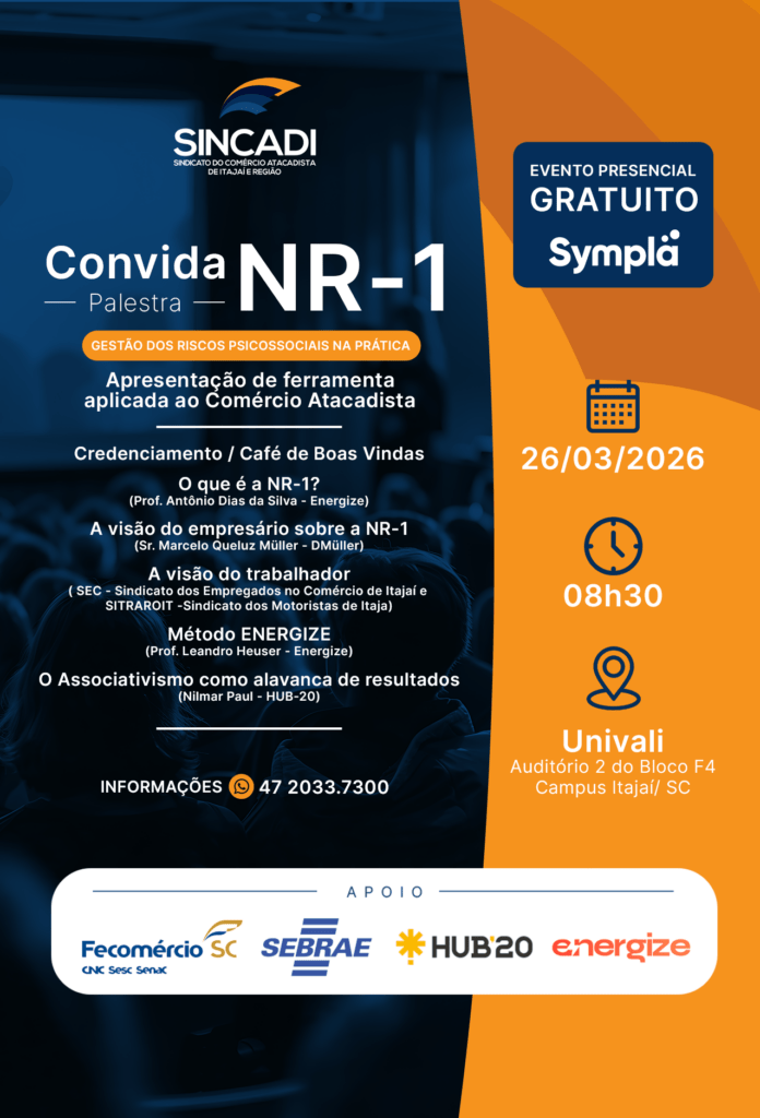 No dia 26 de março (quinta-feira) será realizado, em Itajaí, o evento “NR-1 – Gestão dos Riscos Psicossociais na Prática – Apresentação de ferramenta aplicada ao comércio atacadista”. O encontro ocorrerá no auditório do Bloco F4 da Univali, Campus Itajaí, a partir das 8h30, com entrada gratuita mediante inscrição prévia via Sympla.