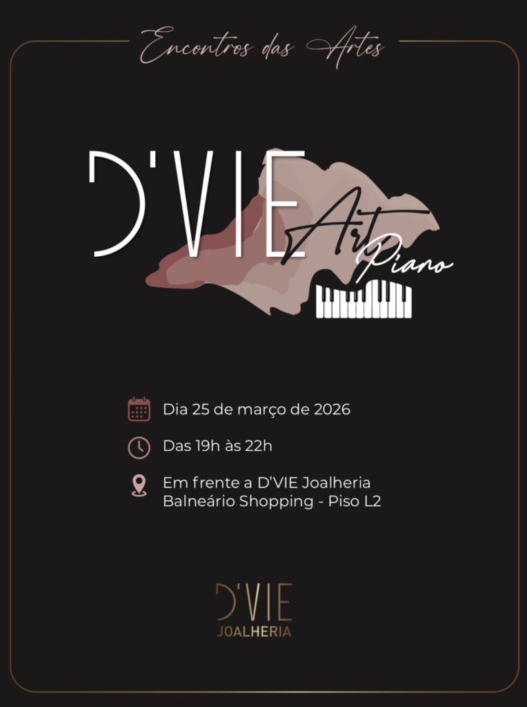 A D’VIE Joalheria realiza nesta quarta-feira (25), das 19h às 22h, no Balneário Shopping, em Balneário Camboriú, o “D’VIE Art Piano” — uma experiência que traduz, em forma e som, o encontro entre arte, sensibilidade e estética contemporânea.
