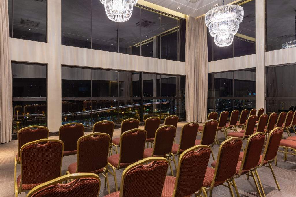 Ao todo, o hotel dispõe de cinco a sete salas internas para eventos, além de um complexo localizado no terraço. Os espaços podem ser configurados para reuniões executivas, treinamentos, workshops, palestras, premiações, celebrações e encontros sociais, com capacidade que vai de pequenas reuniões até eventos com cerca de 180 participantes, dependendo do layout.