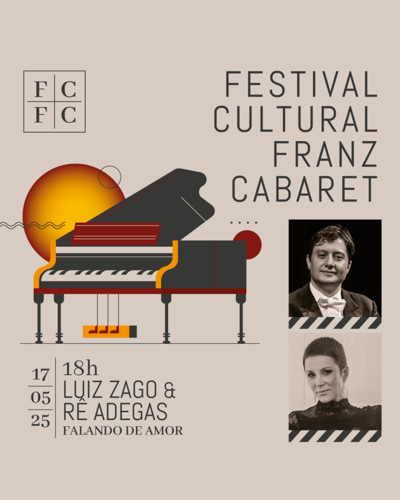 O terceiro encontro do Festival Cultural Franz Cabaret ocorre no sábado, 17 de maio, às 18h, no pátio do Franz Cabaret, com um show que promete emoção e delicadeza em cada nota: o duo formado pela cantora Rê Adegas e pelo pianista Luiz Zago apresenta “Falando de Amor”, uma homenagem intimista ao icônico álbum Elis & Tom, lançado em 1974.