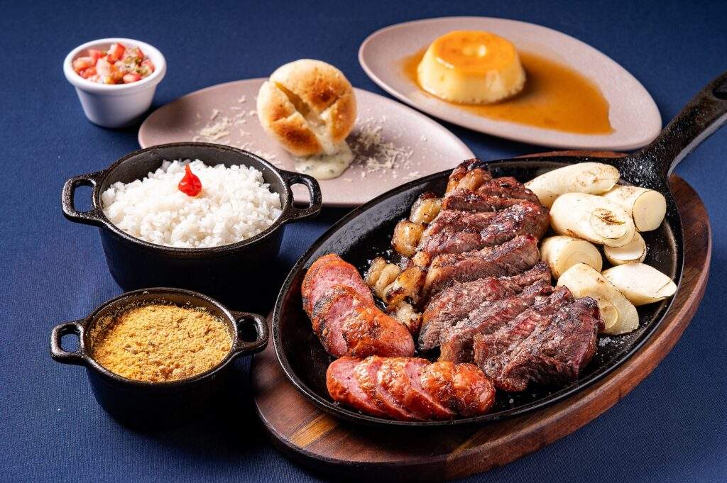 CAMPANO – Uruguai – Entrada: Pan de Ajo com Vinagrete, Principal: Parrilla com Bife de Chorizo, Linguiça, Palmito e Arroz e Sobremesa: Flan de la Abuela com Doce de Leite;