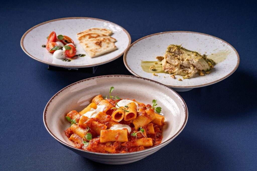 KOMBINA FELICE – Itália – Entrada: Antepasto Caprese com Pão Crocante, Principal: Rigatoni all’Amatriciana e Sobremesa: Tiramisù de Pistache;