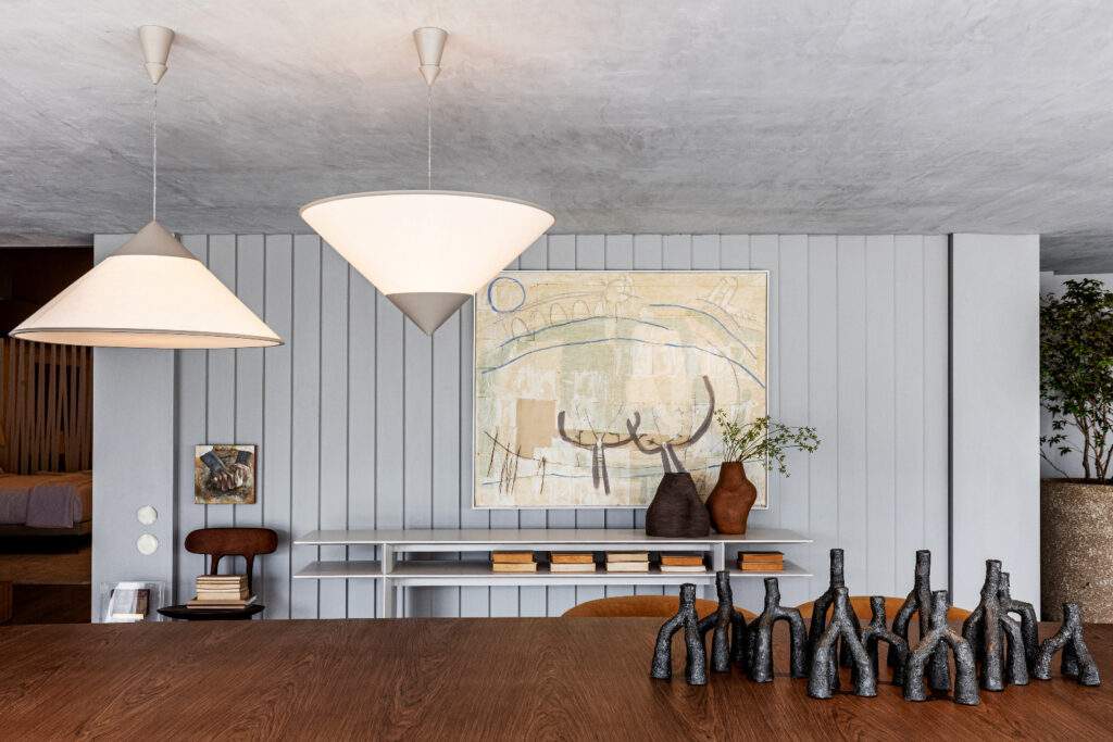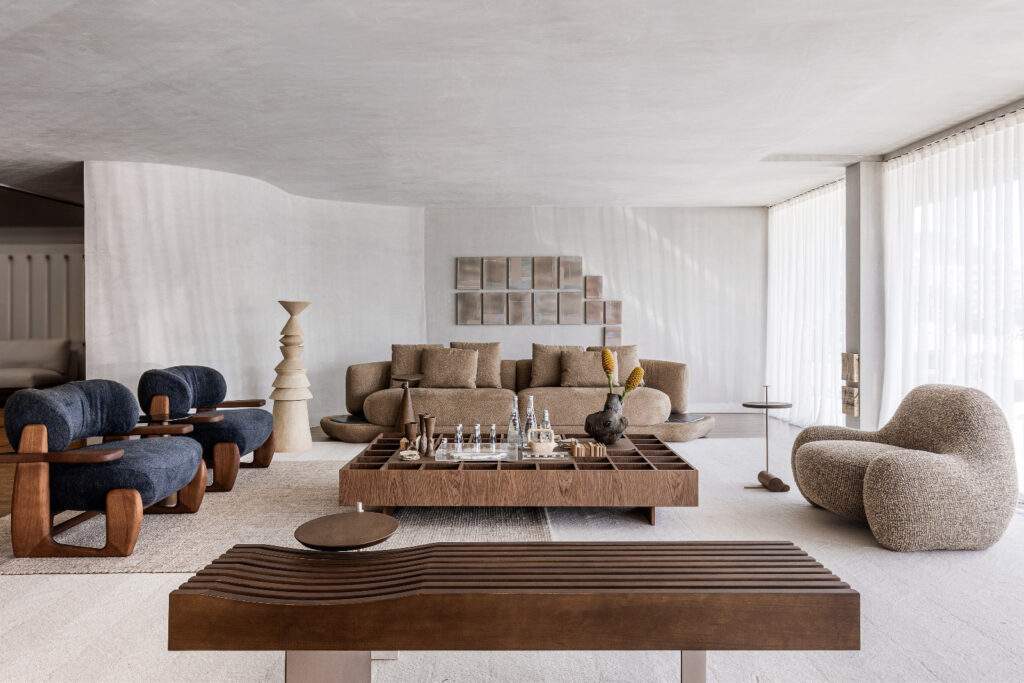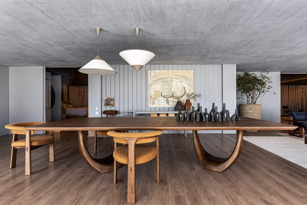 Na área de estar, o sofá Orla, de Maurício Bomfim, funciona como base de permanência. A mesa de centro Filamento, de Fabiana Queiroga, cria um plano que amarra a composição, enquanto as mesas de apoio modulam usos e escalas: Escher, de Ibanez Razzera, Teresa, de Pedro Gallasso, e Taiga, de Ricardo Vidigal. A presença das poltronas Mimoso, Zípe e Elefante, todas de Maurício Bomfim, dá ao espaço um acento mais escultórico, com volumes que se destacam sem romper a harmonia.