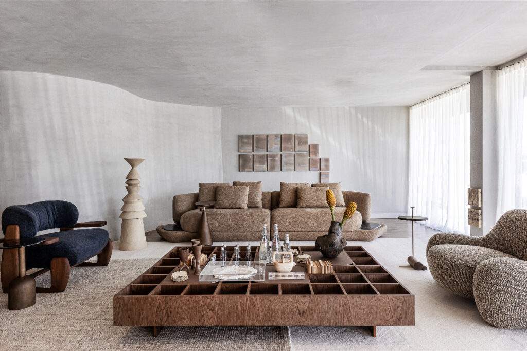 A paleta acompanha a virada de estação, com base sóbria inspirada nos tons outonais e pontos mais quentes que aproximam o espaço do corpo e da rotina. A madeira entra como eixo, presente principalmente nas estruturas dos móveis, e encontra tecidos de diferentes texturas, que criam camadas visuais e uma leitura mais tátil do ambiente. “Reunimos peças com formas marcantes, mas com um desenho que mantém o espaço respirando. A madeira dá o rumo e os tecidos entram como uma segunda pele, com texturas que convidam à permanência”, afirma a arquiteta Beatriz Zeglin.
