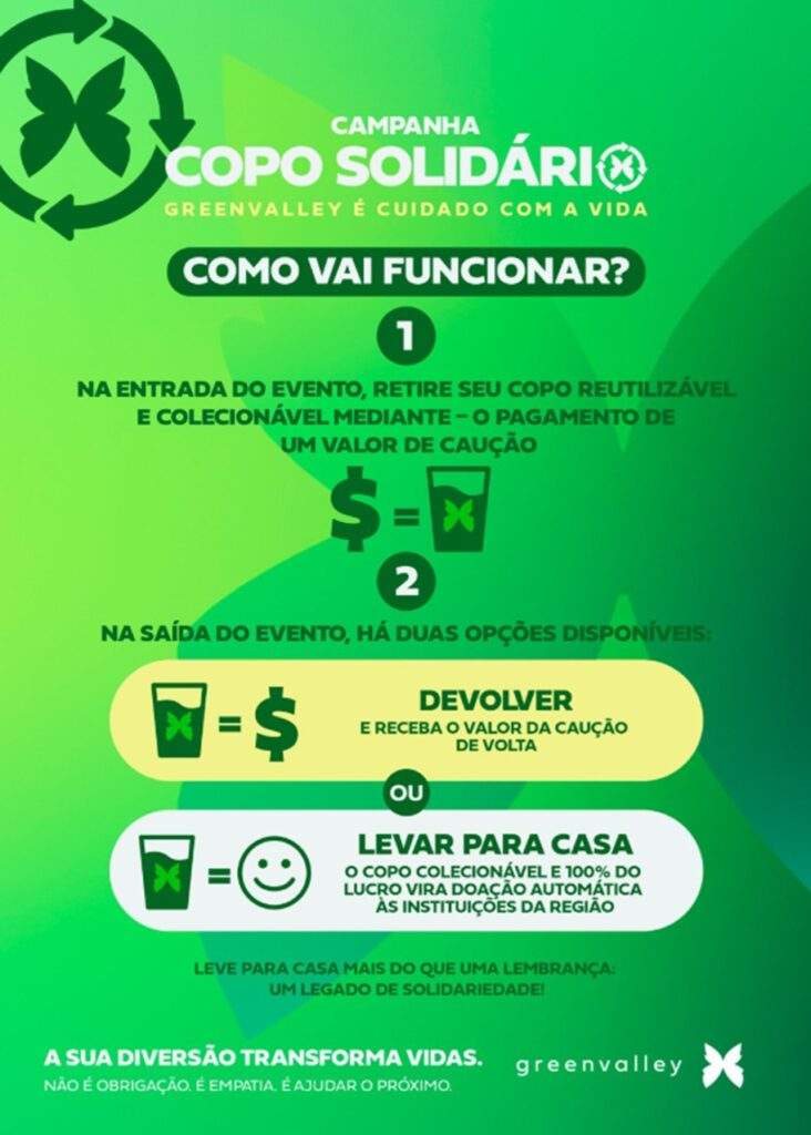 O Greenvalley lança, no dia 29 de novembro, durante o evento que marca seus 18 anos, a campanha Copo Solidário, primeira de uma série de ações socioambientais previstas para os próximos meses. A iniciativa tem como objetivo o fortalecimento de práticas responsáveis e o apoio de projetos sociais da região. A ativação ocorre às vésperas da temporada de verão, seu período de maior movimento, ampliando seu alcance e incentivando o público a adotar escolhas mais conscientes.