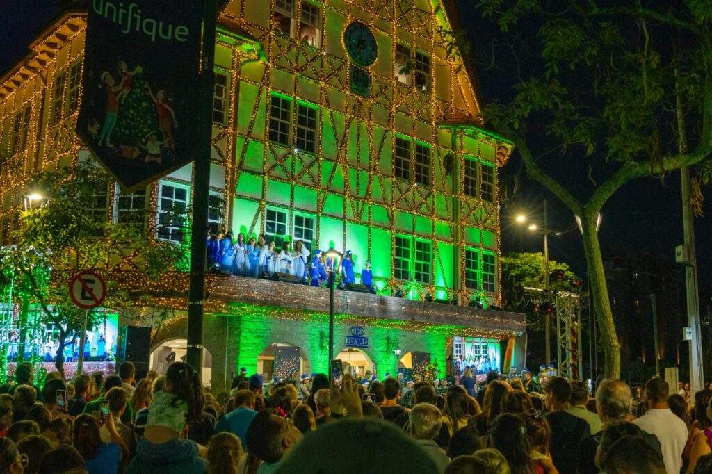 Realizado pelos alunos do Colégio Militar de Blumenau, o espetáculo reúne música, literatura e a magia do Natal em uma única noite. Com um repertório de clássicos natalinos, o prédio histórico do Centro de Blumenau fica todo iluminado durante a apresentação dos estudantes. O evento é gratuito.