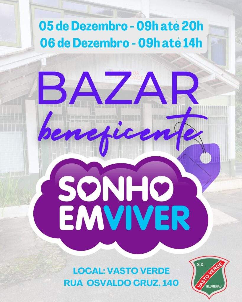 O Instituto Sonho em Viver promove, nos dias 05 e 06 de dezembro, o 1º Bazar Beneficente, com o objetivo de arrecadar recursos para fortalecer suas ações sociais, especialmente a tradicional campanha de Natal, que neste ano alcançará mais de 70 instituições que atendem pessoas em situação de vulnerabilidade. O evento será realizado na Sociedade Desportiva Vasto Verde, situada na Rua Osvaldo Cruz, 140, Bairro Velha, em Blumenau.