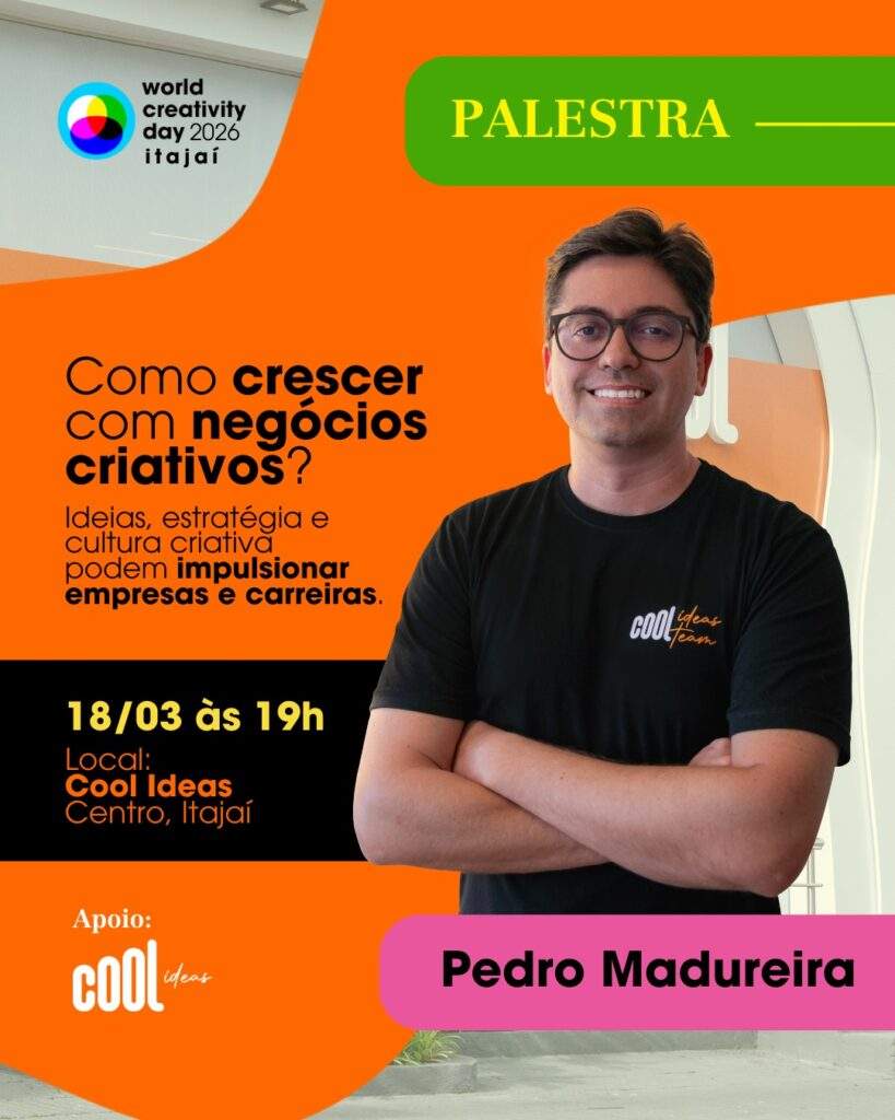 Itajaí é uma das cidades-sede do Dia Mundial da Criatividade 2026 (21 de abril) e já começa a “aquecer as ideias” nesta semana. O evento preparatório contará com palestra do publicitário Pedro Madureira, que vai compartilhar sua experiência sobre como transformar a criatividade em uma estratégia de crescimento para empresas e negócios. A ação é aberta ao público e ocorrerá nesta quarta-feira, 18 de março, às 19h, na Cool Ideas, no Centro da cidade. A entrada é gratuita e os ingressos devem ser retirados neste link.