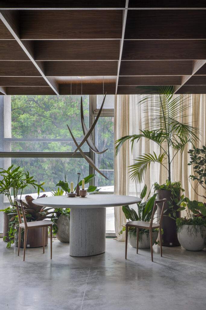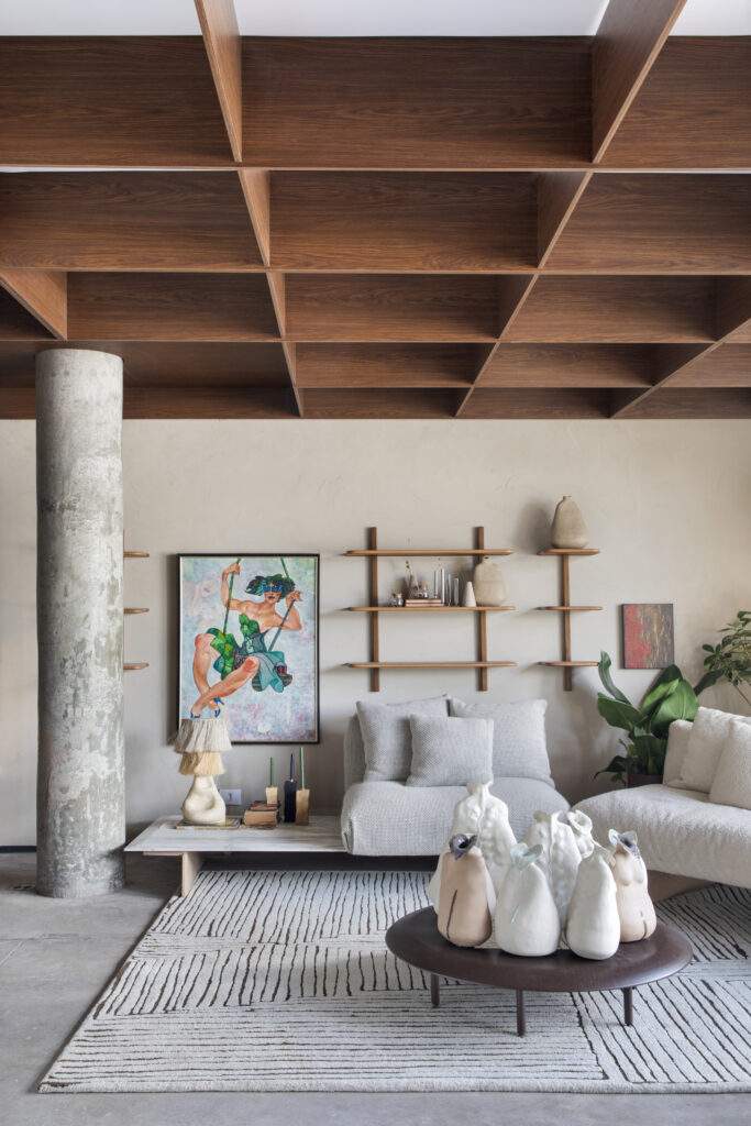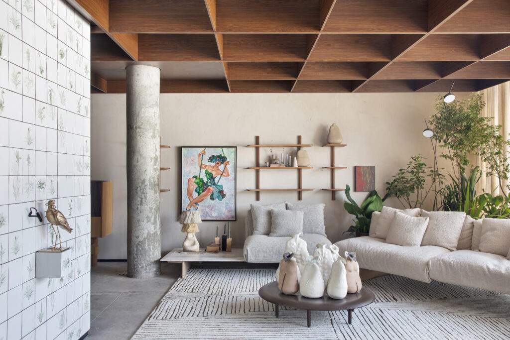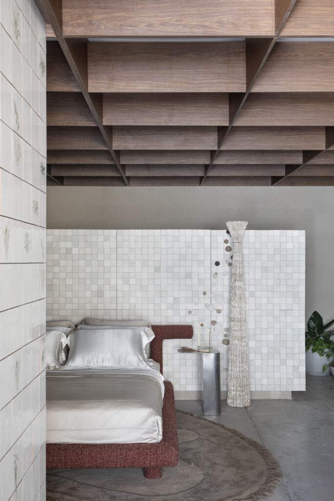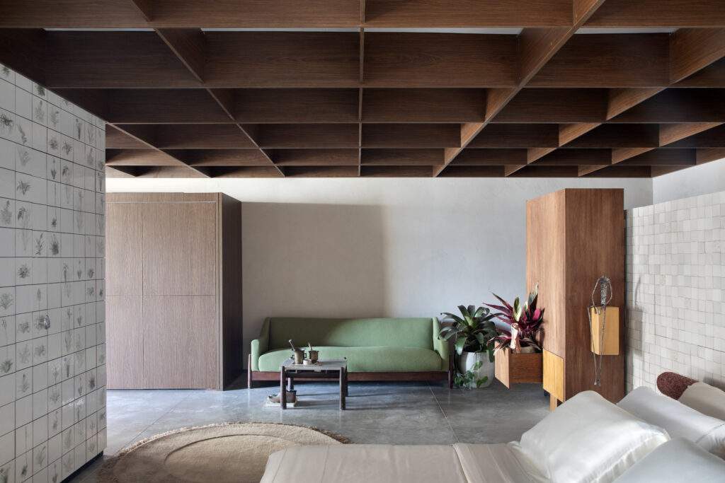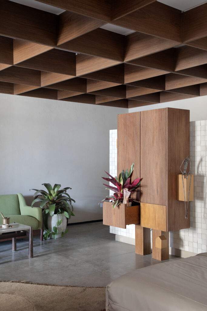 O cubo resolve também uma questão funcional. O edital da BAB exigia que cada pavilhão configurasse um apartamento completo, com banheiro, lavabo e lavanderia. Em vez de fragmentar o espaço em cômodos convencionais, Branco concentrou toda a infraestrutura rígida dentro desse volume, liberando o entorno para uma planta livre, orgânica, sem divisões físicas. O living, a cozinha, a suíte e o home office se organizam ao redor do cubo em quatro zonas fluidas, conectadas por um percurso de 360 graus que convida o visitante a descobrir, a cada passo, uma nova peça da curadoria.