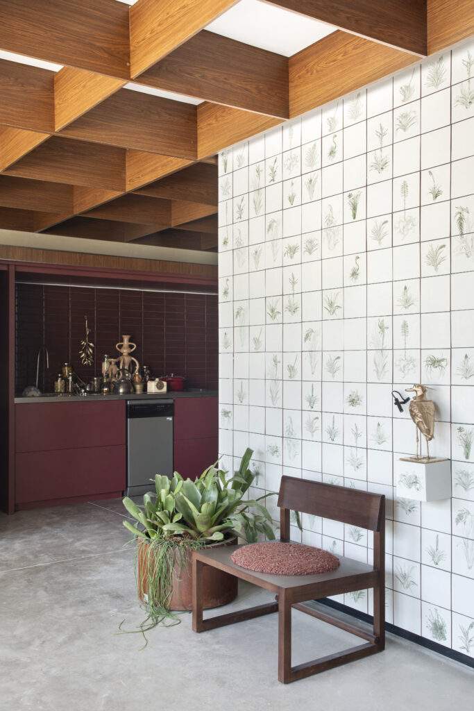 A materialidade reforça a narrativa. As paredes recebem acabamento em argila natural, sem componentes químicos. No teto e no fechamento da cozinha, painéis em tons amadeirados e avermelhados. Todos os metais são em inox e prata. O paisagismo, assinado por Laura Rotter, apresenta de forma inédita o projeto Jardim Bioma. A pesquisa investiga o apagamento da flora nativa no imaginário urbano ao resgatar espécies da Mata Atlântica catarinense que historicamente não encontram espaço no paisagismo comercial. No home office do pavilhão, o ambiente funciona como um centro de pesquisa vivo: vidros com sementes especiais e croquis botânicos da paisagista dialogam com a azulejaria de Walmor Corrêa e celebram o legado de Padre Raulino Reitz.