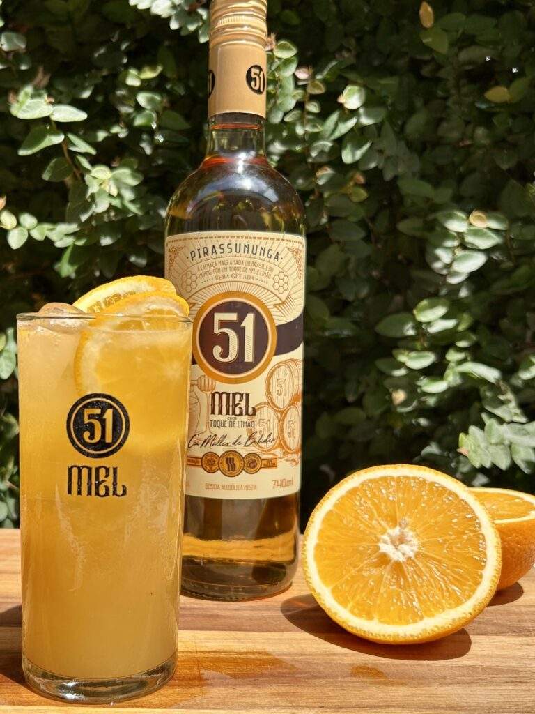 Em uma coqueteleira adicione os pedaços de laranja, adicione 50 ml de Cachaça 51 Mel e o gelo. Bata bem. Em um copo long drink, preencha com gelo, o drink e complete o copo com refrigerante de guaraná.