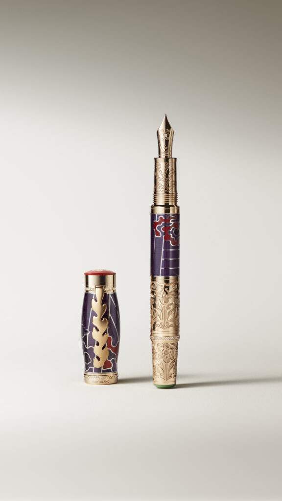 A tampa em ouro maciço rosa 750 é coroada com o emblema da Montblanc em madrepérola iridescente, que evoca a luz mutável do oceano. A pena artesanal, também em ouro maciço rosa 750 e parcialmente revestida a ródio, exibe a letra grega Phi (Φ), que simboliza a proporção áurea (1,618…), juntamente com detalhes inspirados na obra de Matisse, Polinésia, O Céu. Limitada a 161 peças em referência a essa proporção divina, a edição incorpora harmonia, artesanato e a influência de terras distantes e cores luminosas na obra de Matisse.