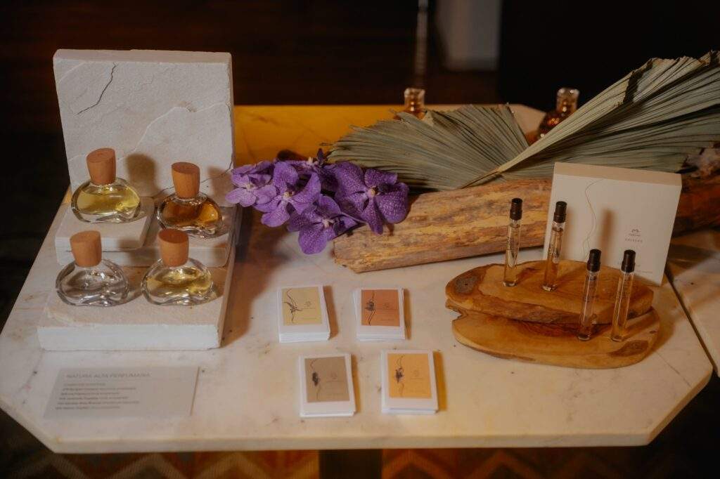 Durante a experiência em Florianópolis, os convidados tiveram contato com fragrâncias autorais que traduzem a identidade olfativa da marca. As composições são veganas e utilizam óleos essenciais proprietários da Natura, extraídos de forma regenerativa de regiões da Amazônia e outros biomas latino-americanos, em parceria com comunidades locais. Hoje são 24 óleos essenciais que somente a marca tem, dentre eles a priprioca, capitiú, cumaru, ambrette e breu branco. Estes ingredientes únicos e autênticos são combinados com matérias-primas nobres da perfumaria internacional, como íris, vetiver, sândalo e benjoim, para criar perfumes multifacetados, com design sofisticado e performance marcante.